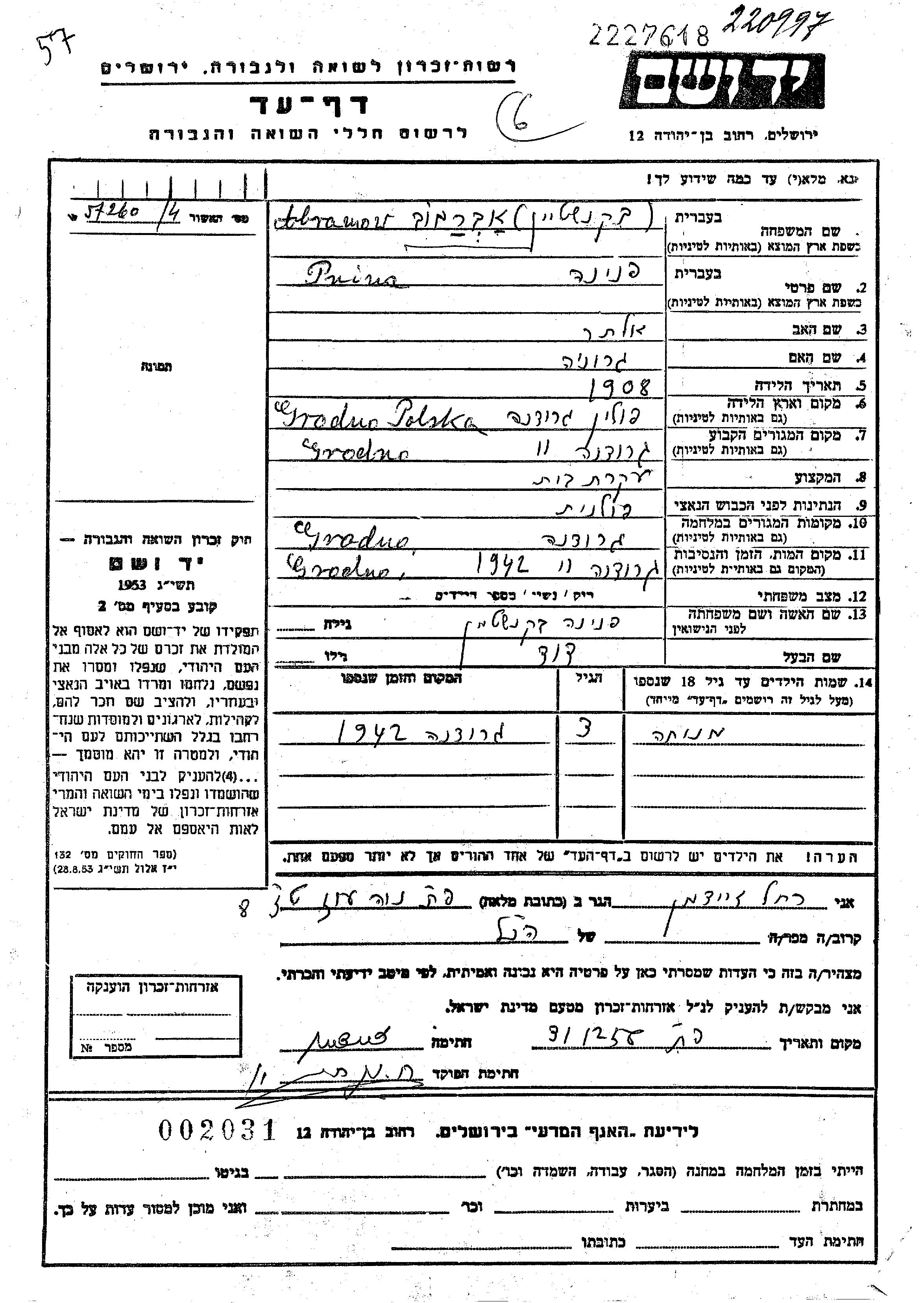 Abramow Pnina 1908 Grodno, Pologne Feuille de témoignage