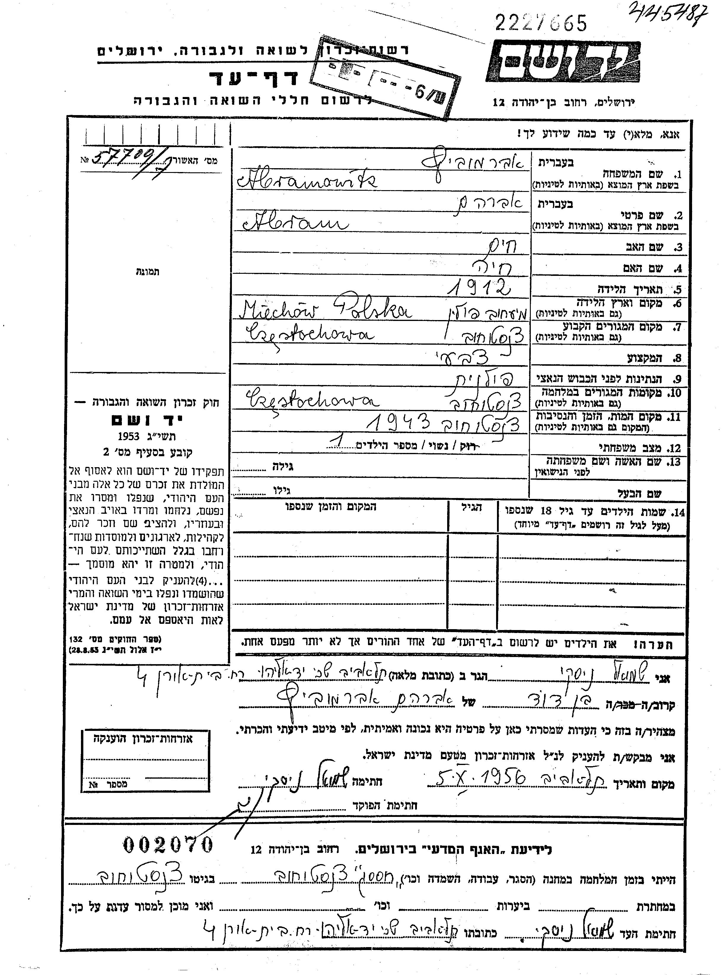 Abramowitz Abram 1912 Czestochowa, Pologne Feuille de témoignage