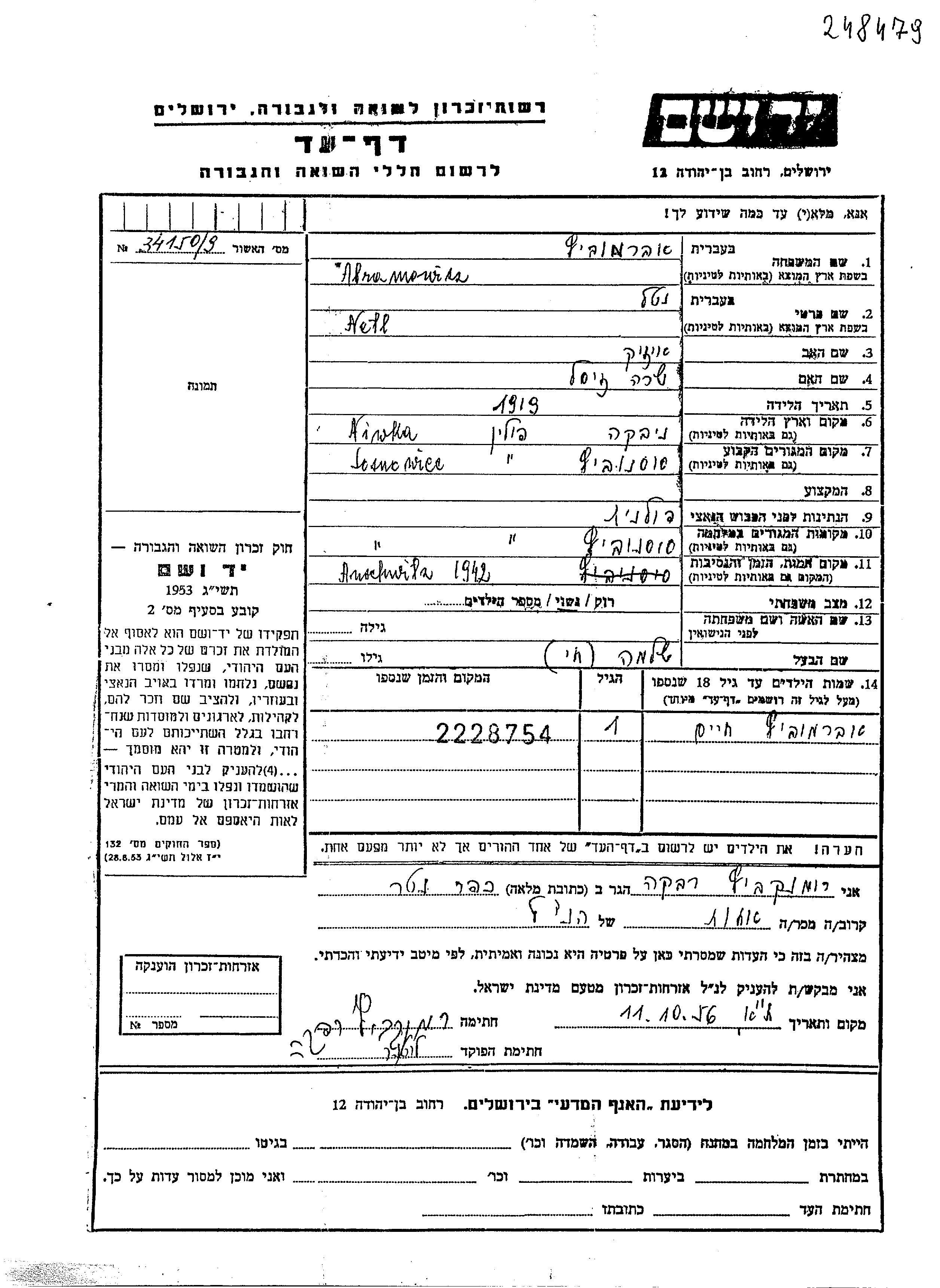 Yad Vashem - Pages of Testimony Names Memorial Collection