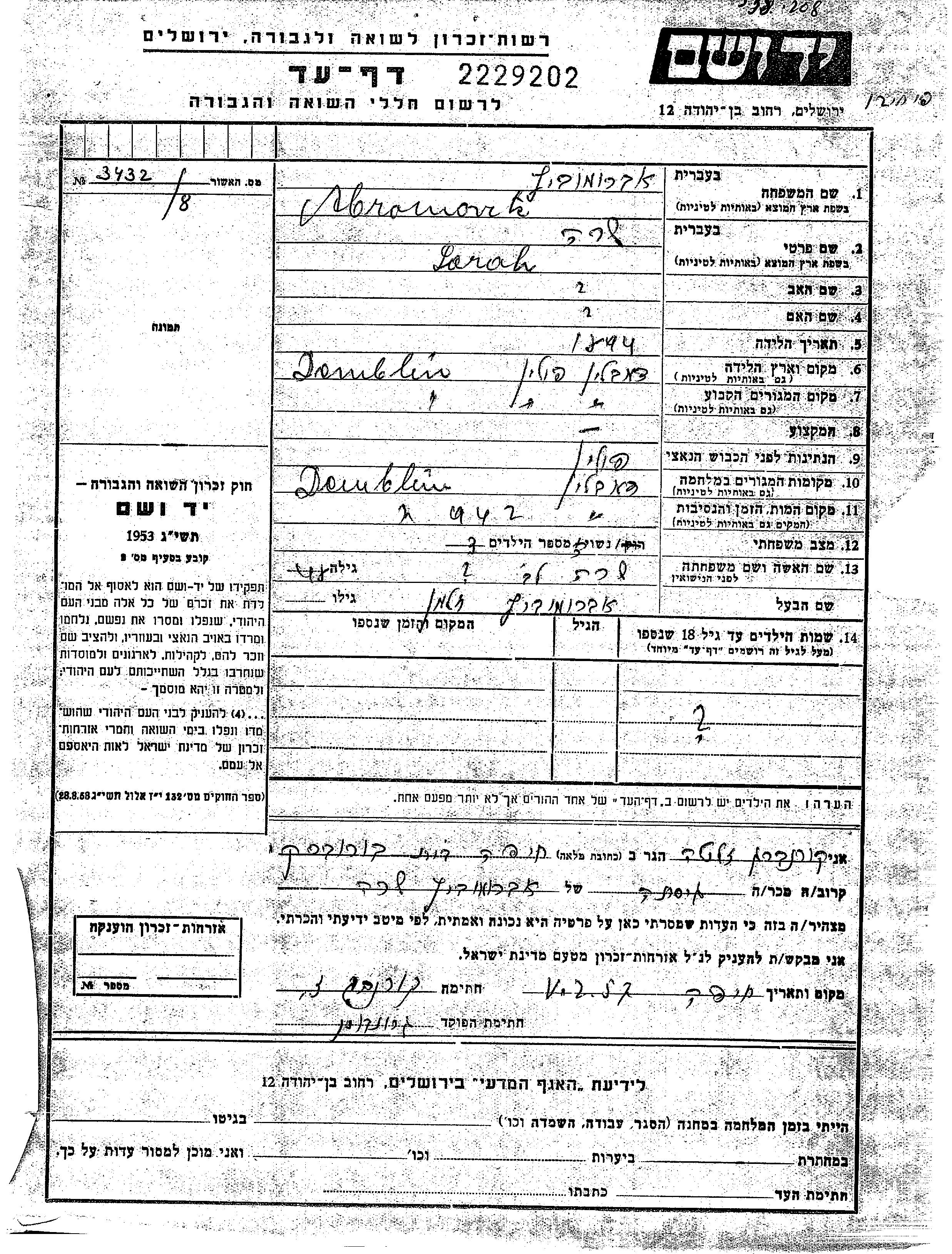 Abramovitz Sarah 1894 Demblin, Pologne Feuille de témoignage