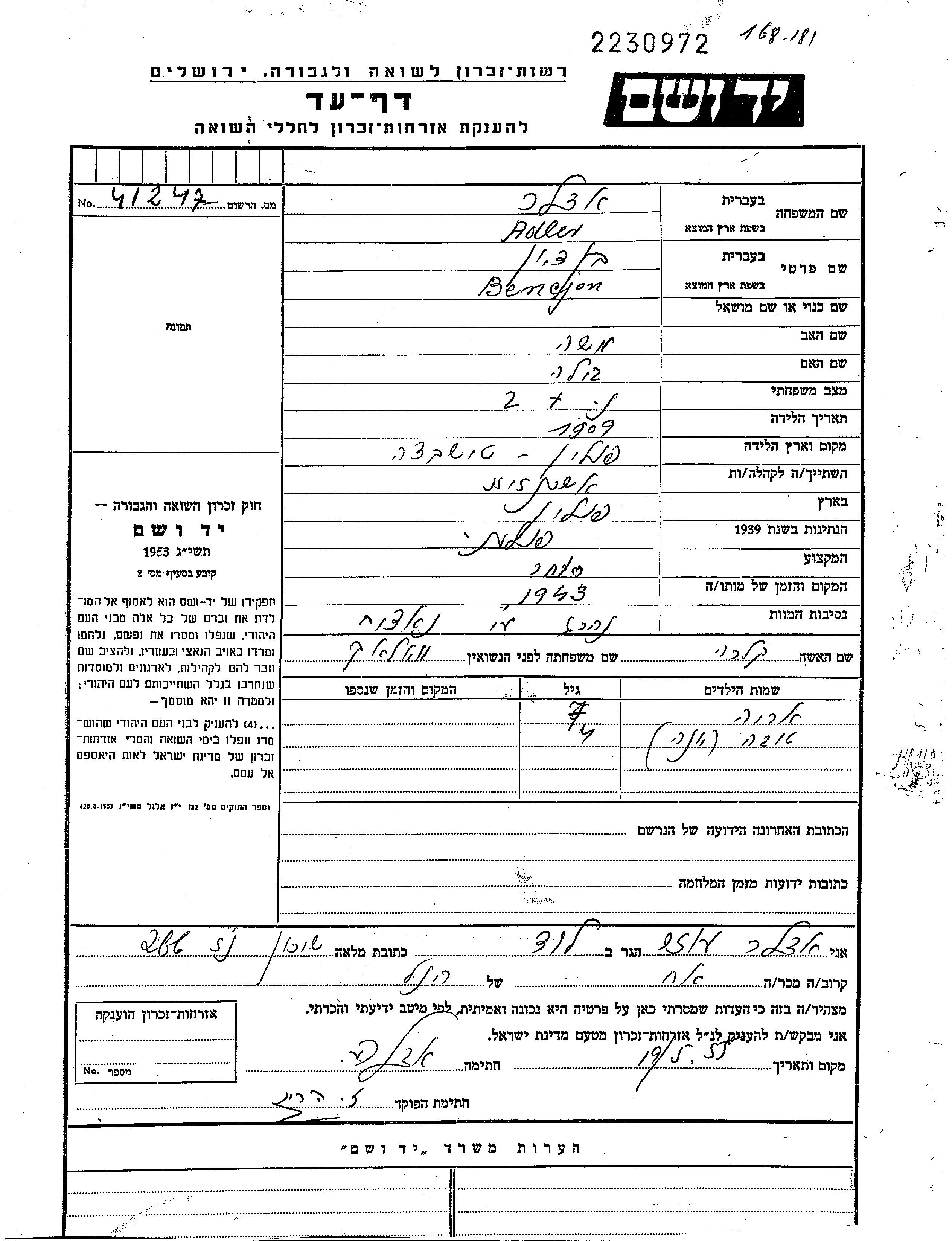 Adler Bencjon Ben 1909 Izbica, Pologne Feuille de témoignage