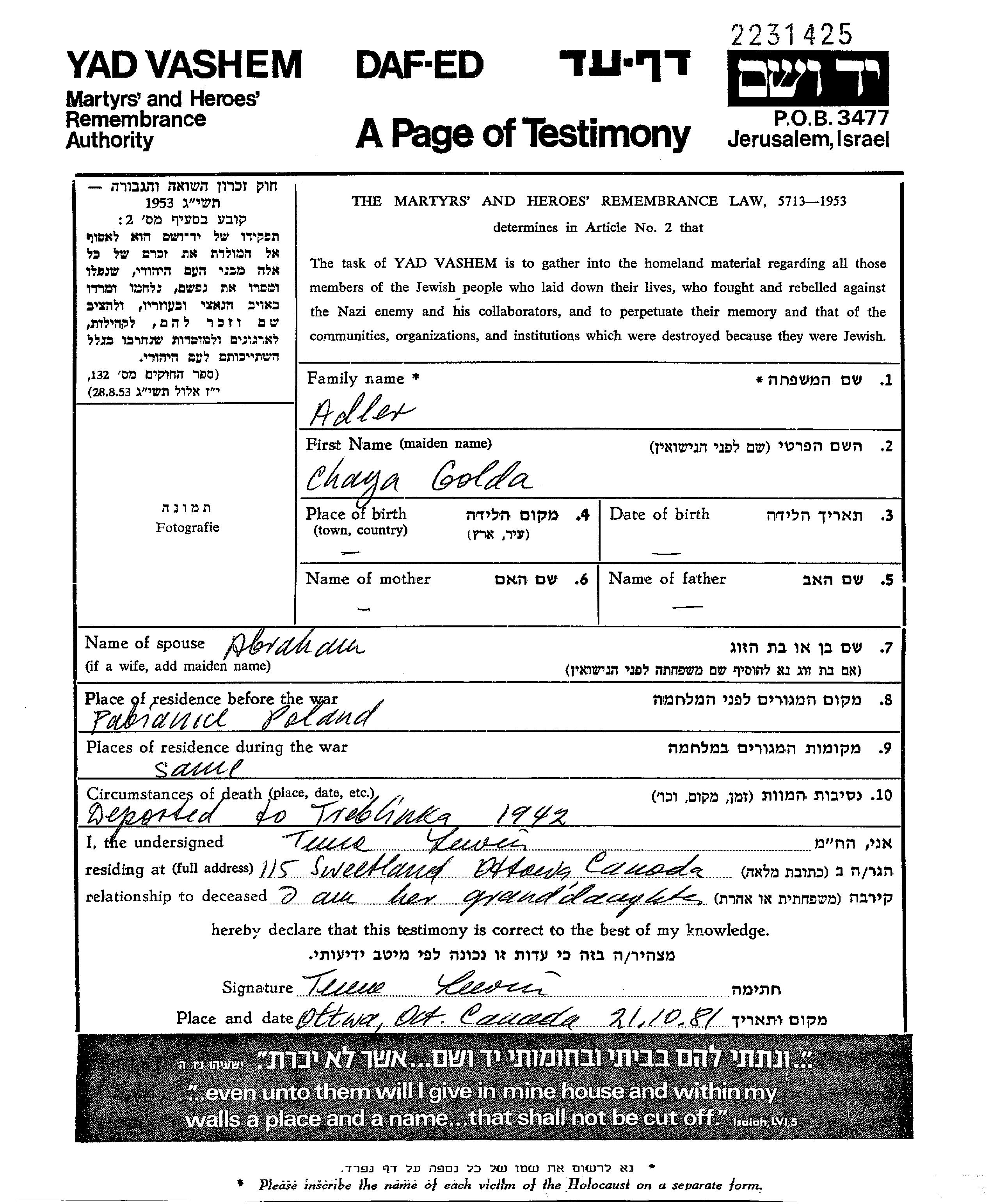 Chaya Golda Adler. Elle était Mariée à Abraham. Avant la seconde guerre mondiale elle vivait à Pabianice, Pologne. Pendant la guerre, elle était à Pabianice, Pologne.