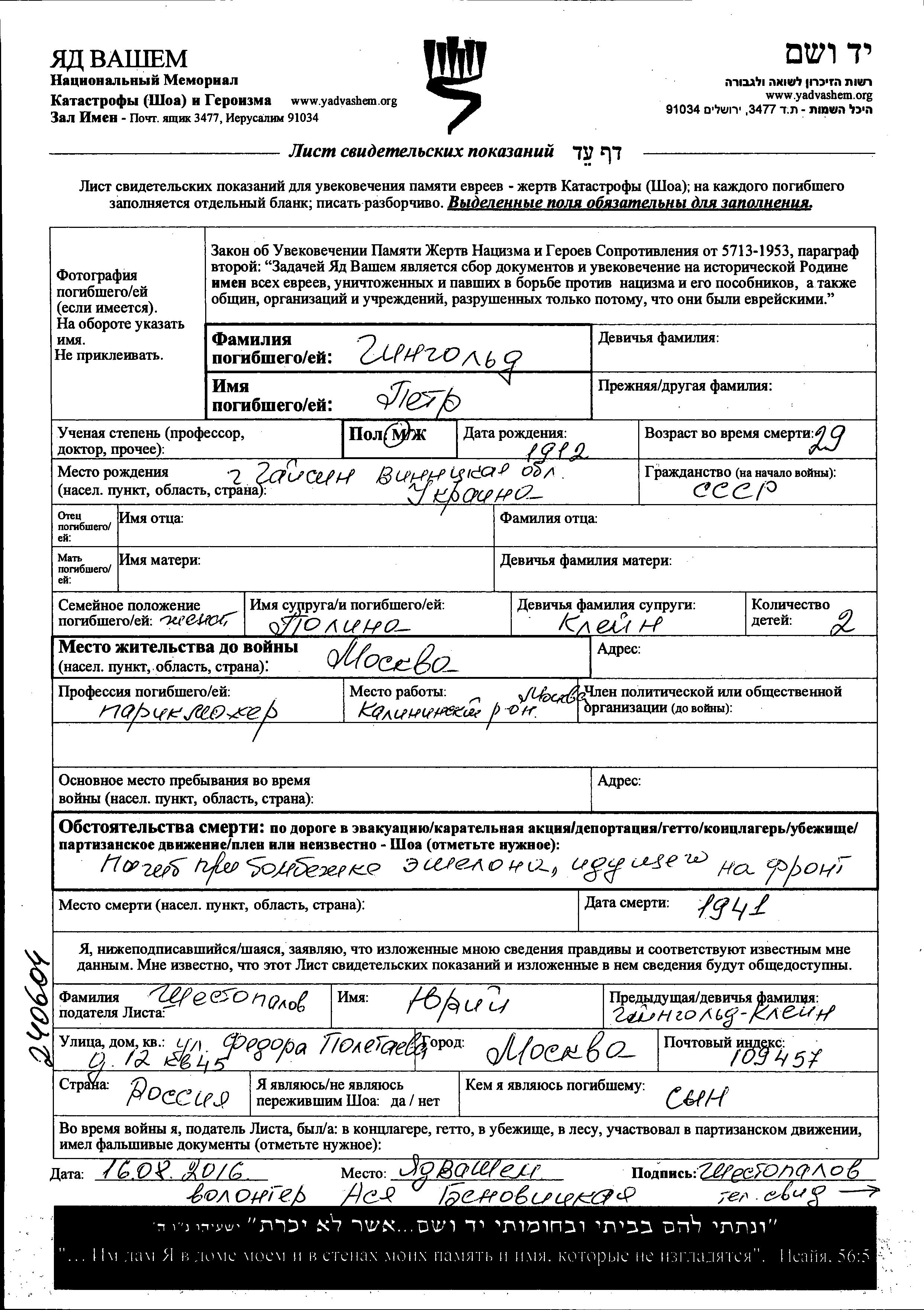 Yad Vashem - Pages of Testimony Names Memorial Collection