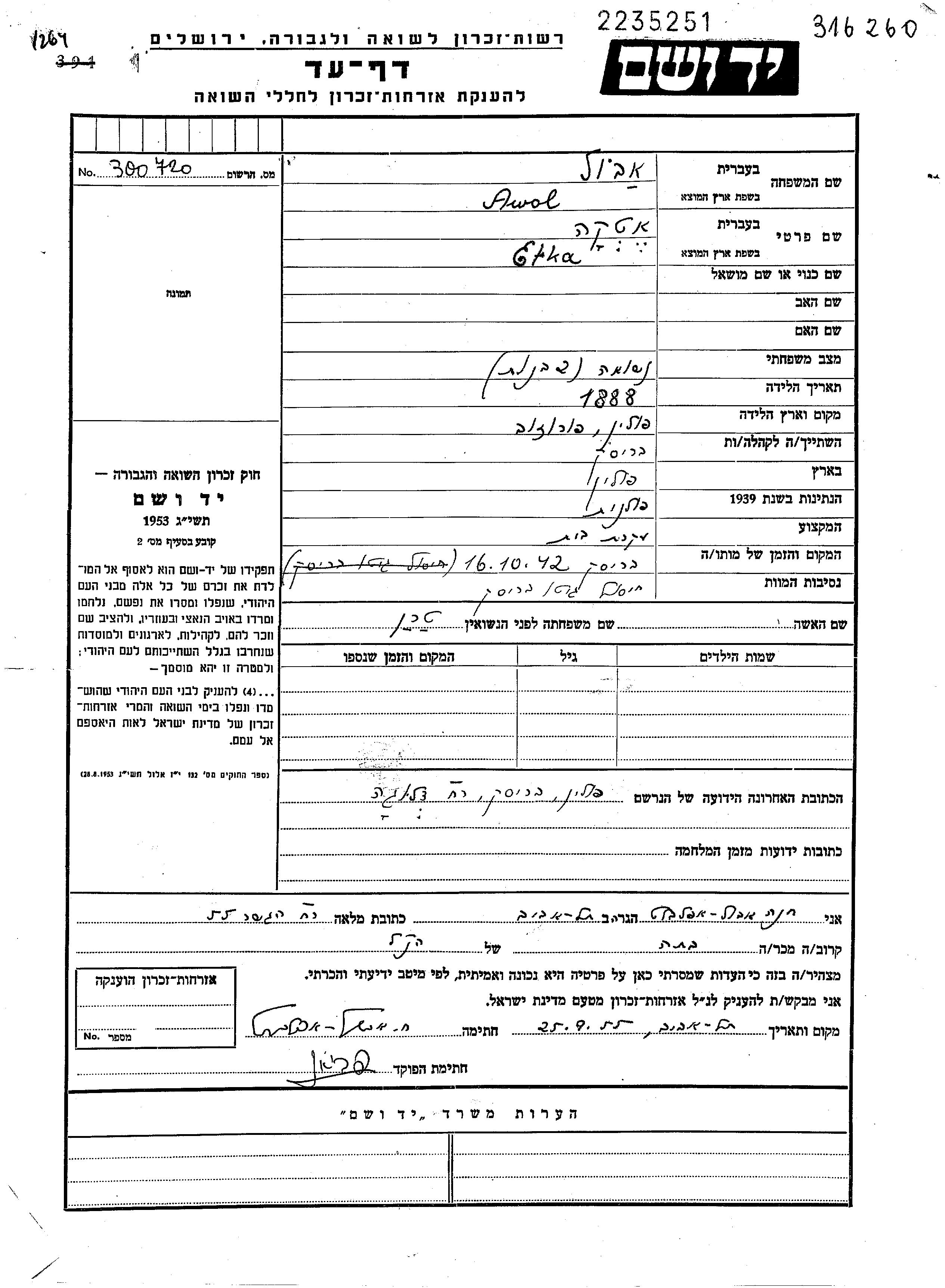 Yad Vashem - Pages of Testimony Names Memorial Collection