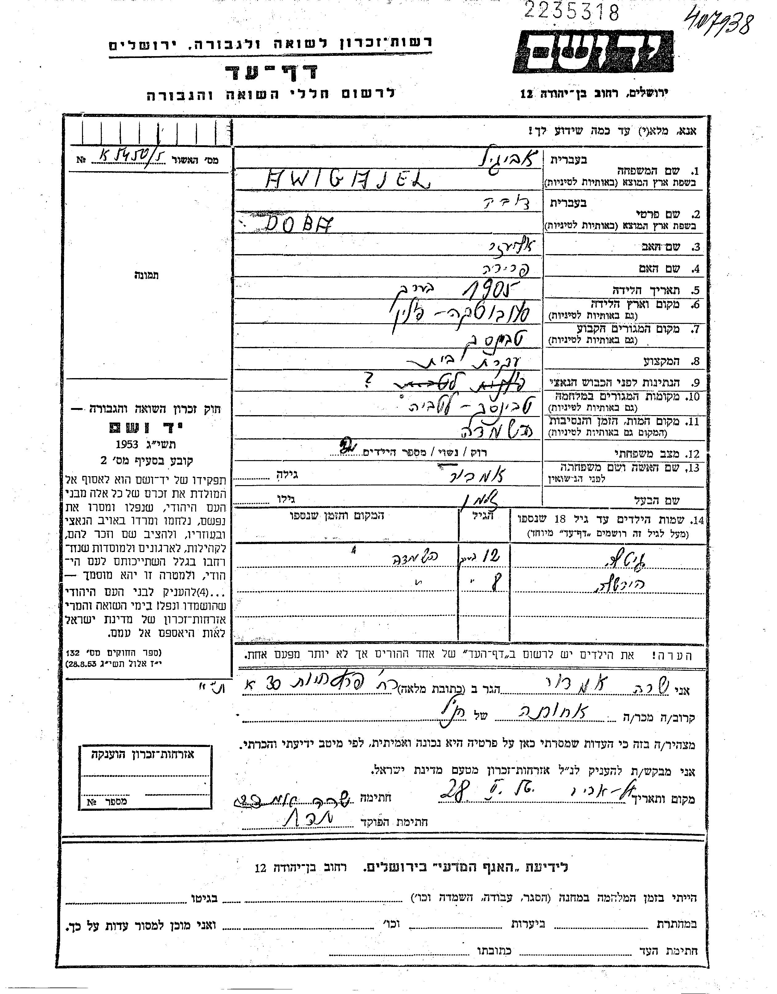 Yad Vashem - Pages of Testimony Names Memorial Collection