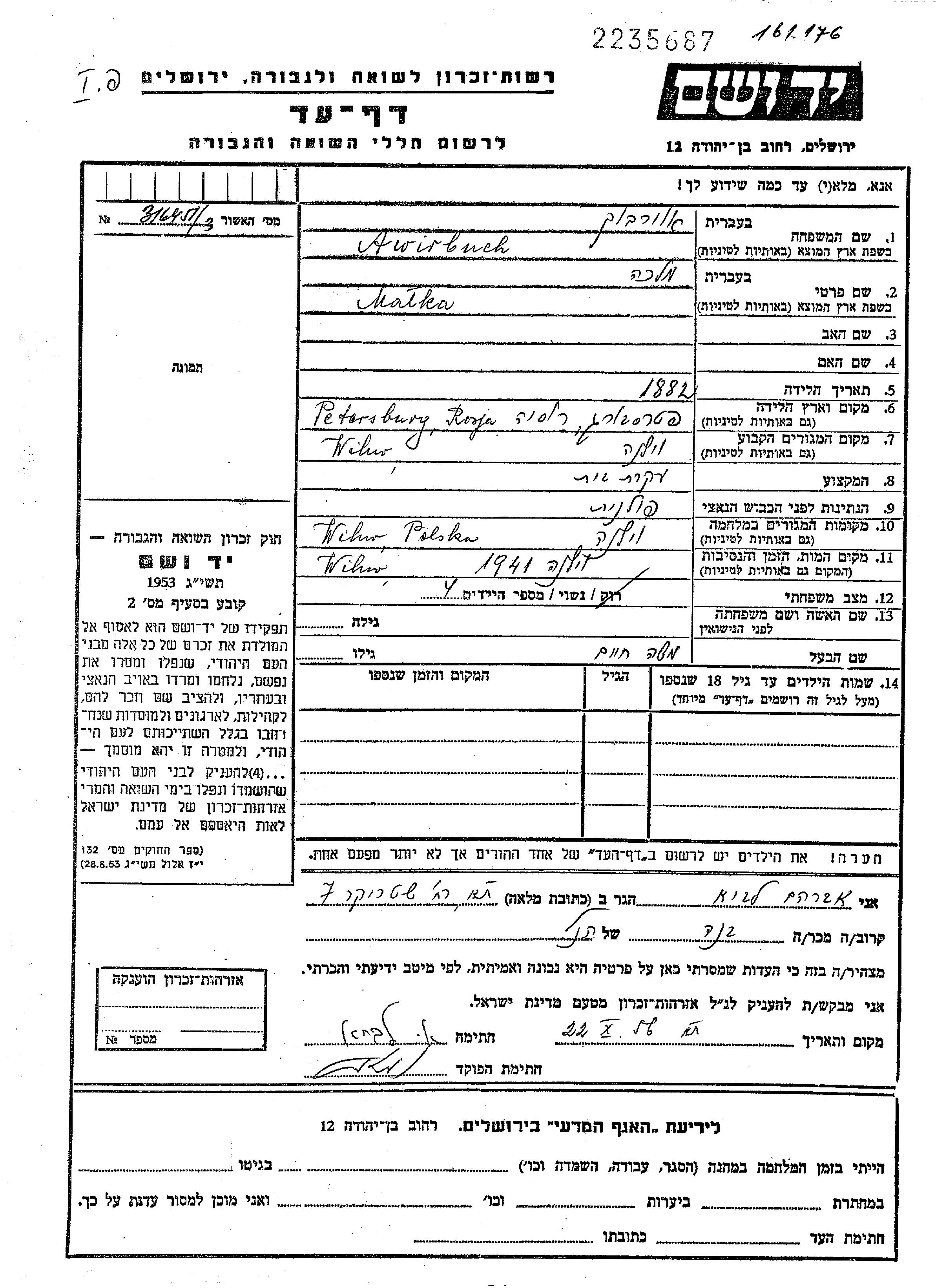 Malka Awerbuch est née à Petersburg, Russie (URSS) en 1882. Elle était Femme au foyer et Mariée à Haim Moshe. Avant la seconde guerre mondiale elle vivait à Wilno, Pologne. Pendant la guerre, elle était à Wilno, Pologne.