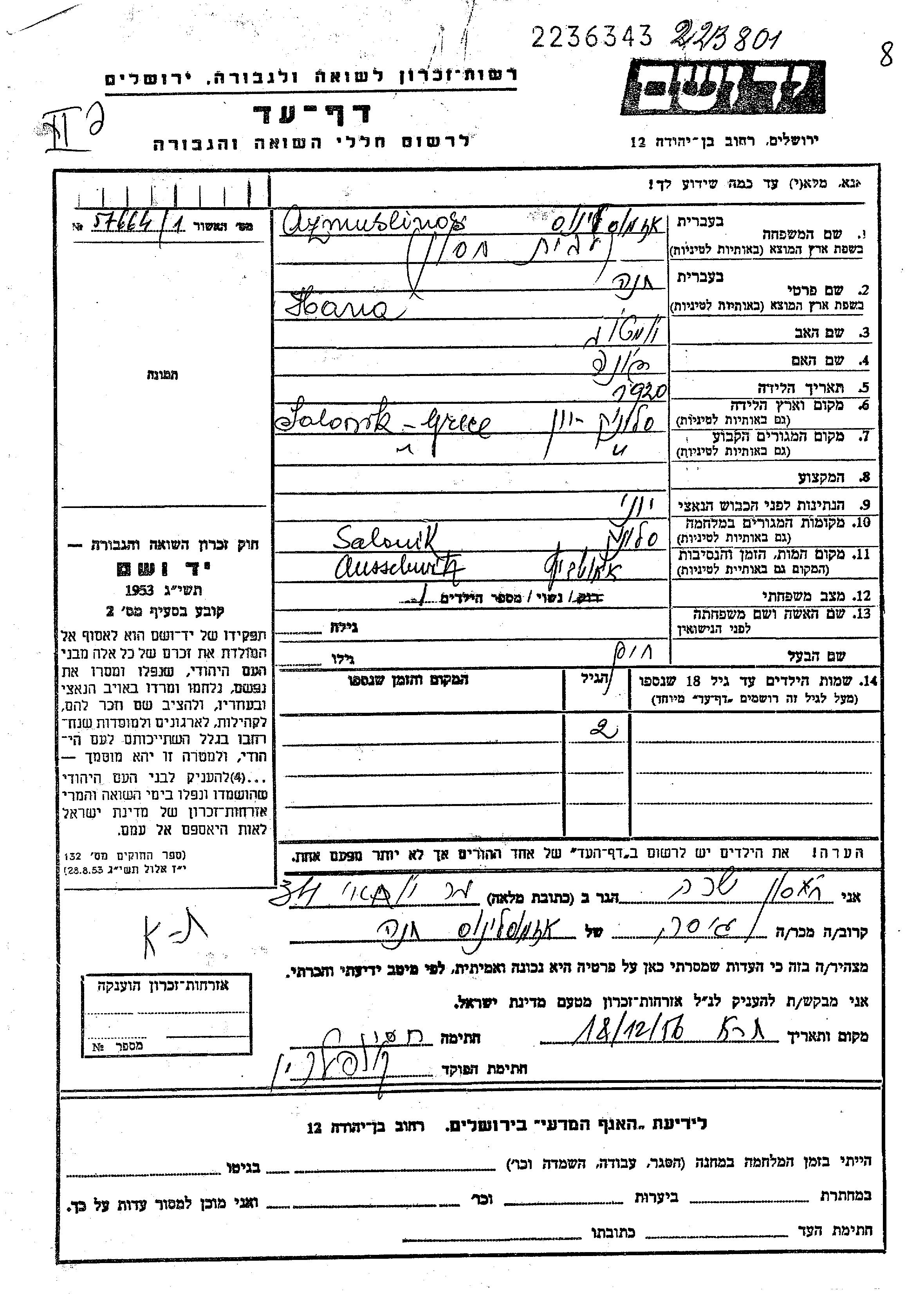 Azmuslinos Hana 1920 Saloniki, Grèce Feuille de témoignage