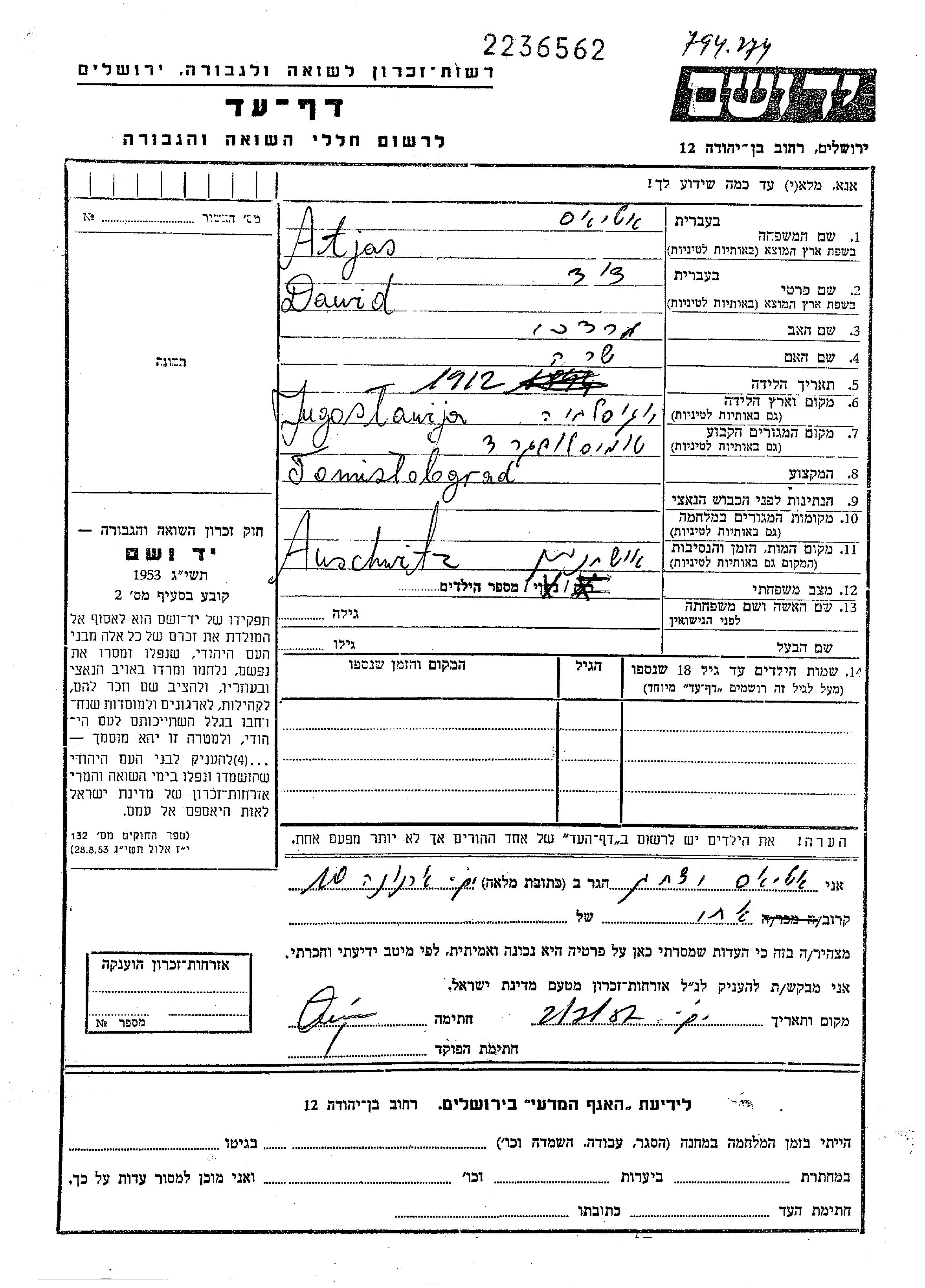 Dawid Atjas est né à Yugoslavie en 1912. Avant la seconde guerre mondiale il vivait à Yugoslavie. Au cours de la guerre, il était à Yugoslavie.