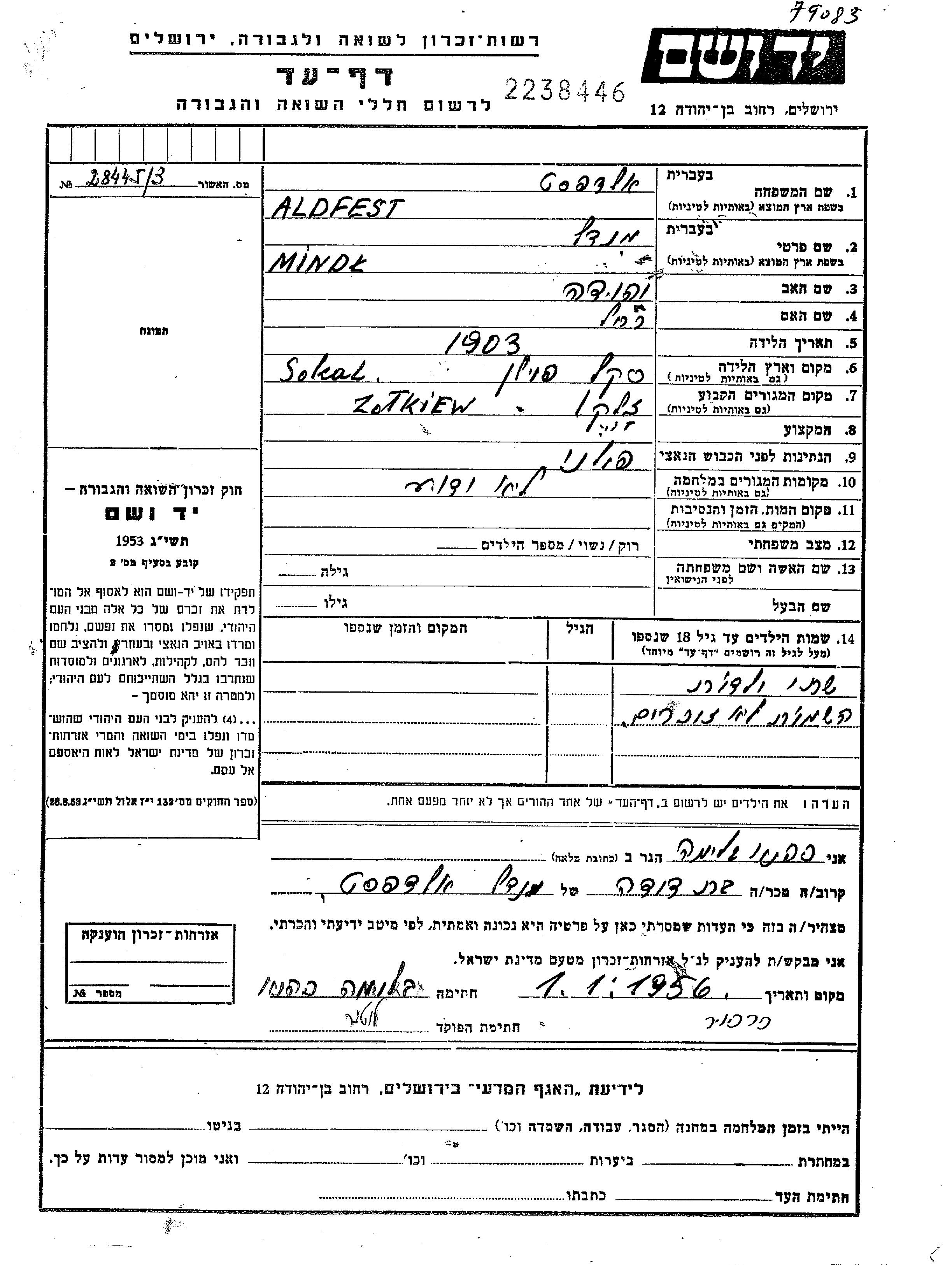 Mindl Aldfest est née à Pologne en 1903, fille de Yehuda et de Rakhel. Avant la seconde guerre mondiale elle vivait à Zolkiew, Pologne.