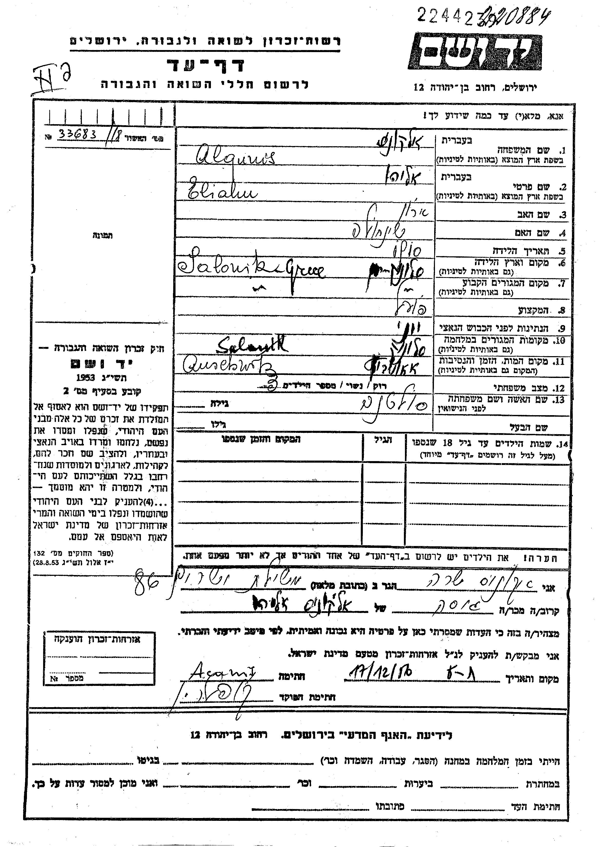 Alqunis Eliahu Saloniki, Grèce Feuille de témoignage