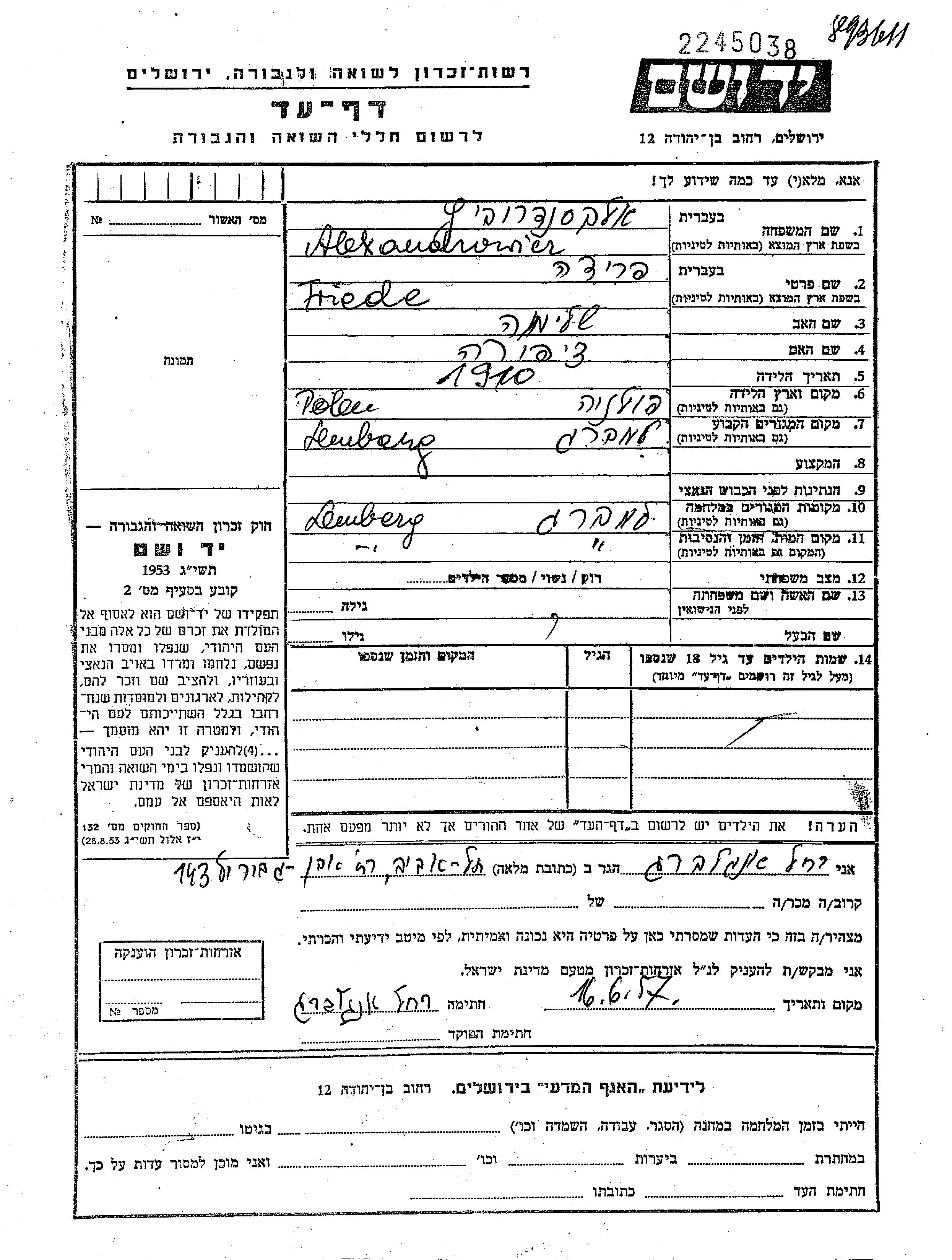 Friede Alexandrowicz est née à Pologne en 1910, fille de Shlomo et de Tzipora. Avant la seconde guerre mondiale elle vivait à Lemberg, Pologne. Pendant la guerre, elle était à Lemberg, Pologne.