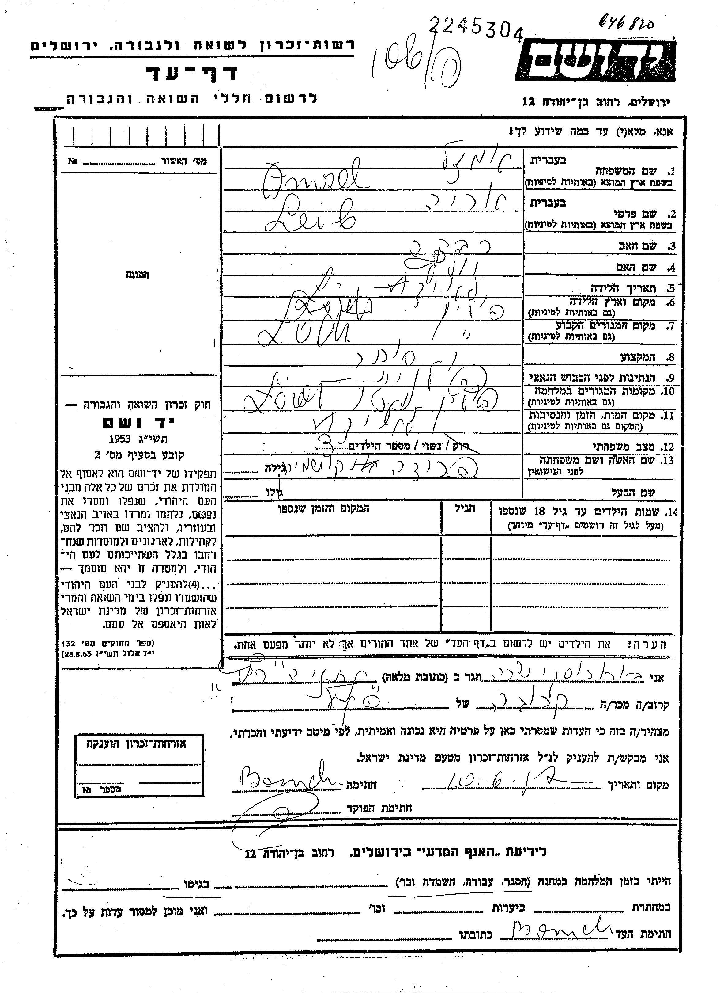 Yad Vashem - Pages of Testimony Names Memorial Collection