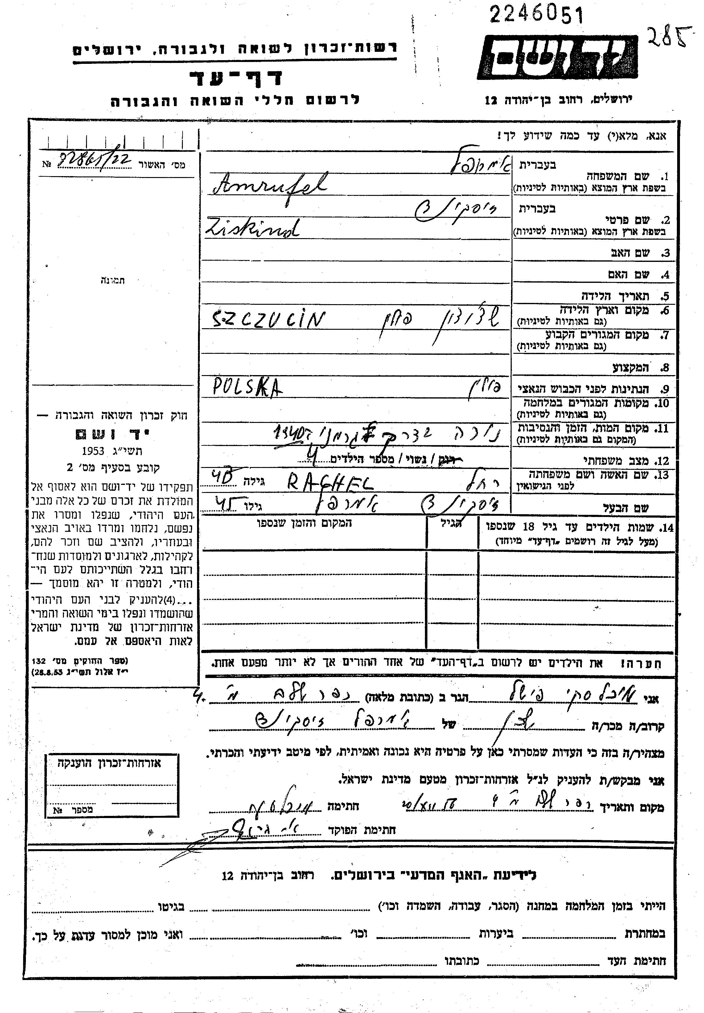 Amrufel Ziskind Szczuczyn, Pologne Feuille de témoignage