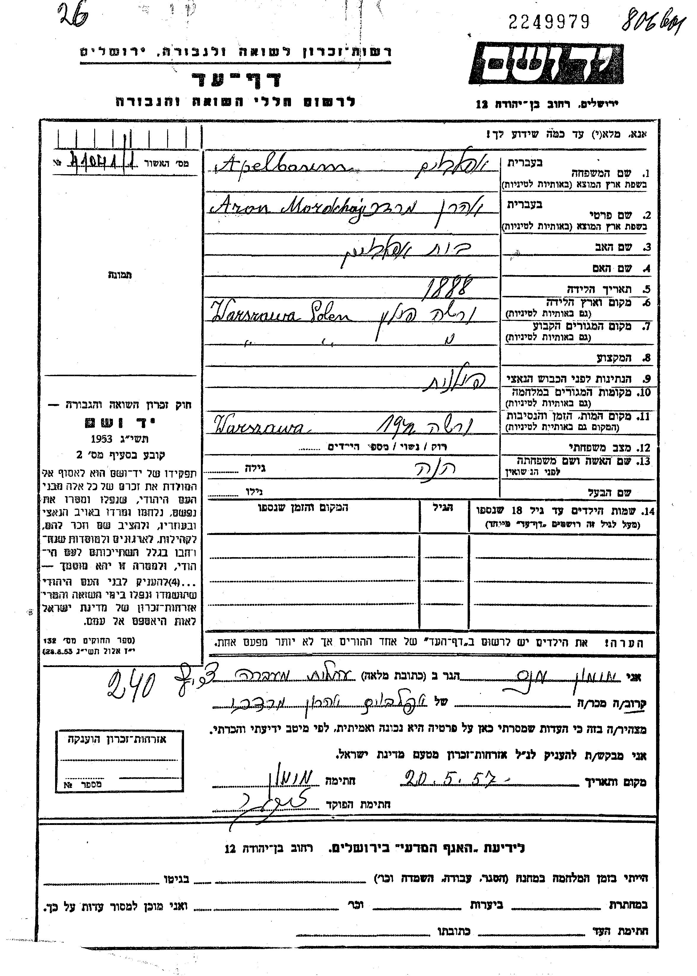 Apelbaum Aron Mordchaj 1888 Warszawa, Pologne Feuille de témoignage