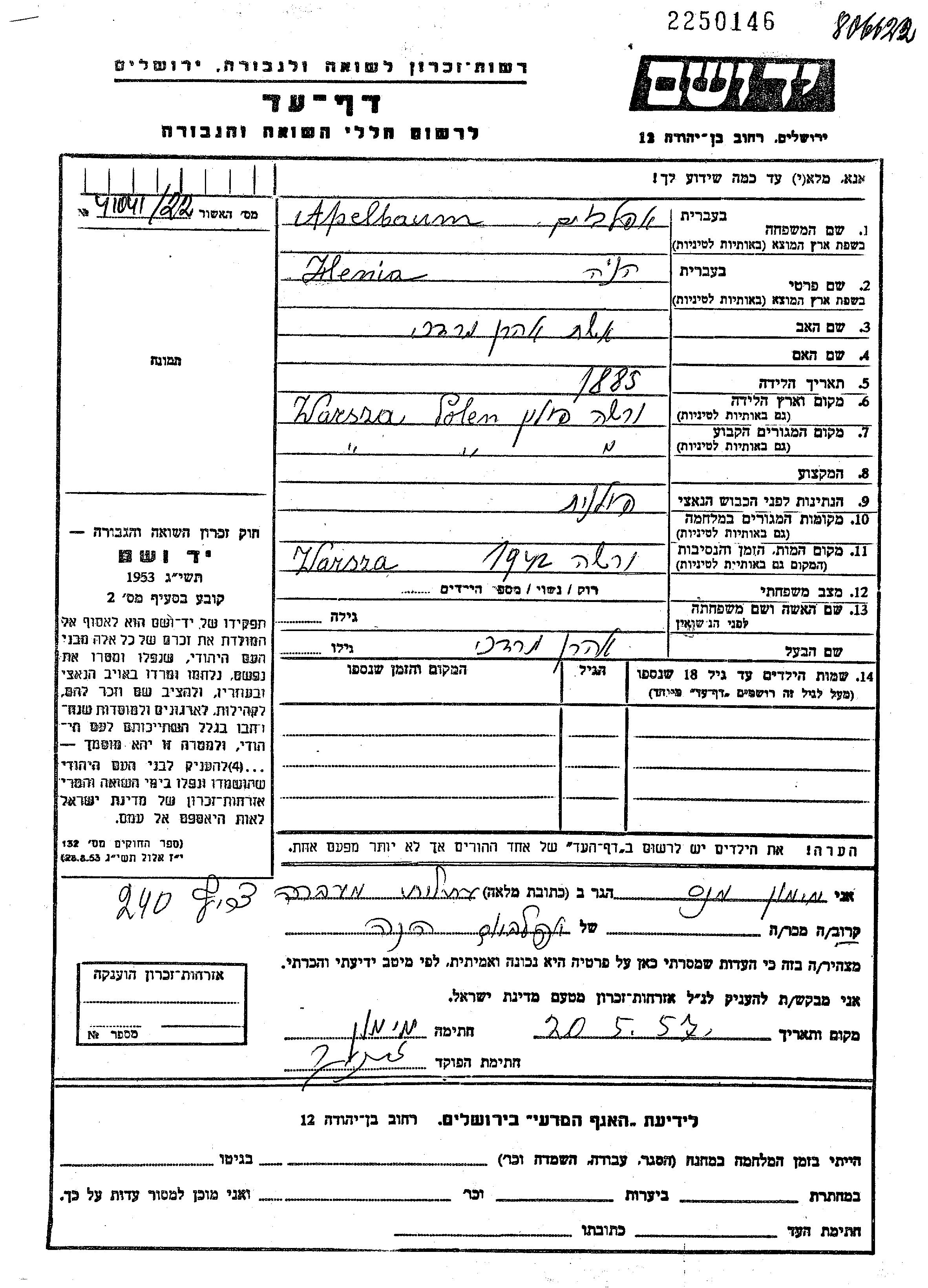 Apelbaum Henia 1885 Warszawa, Pologne Feuille de témoignage