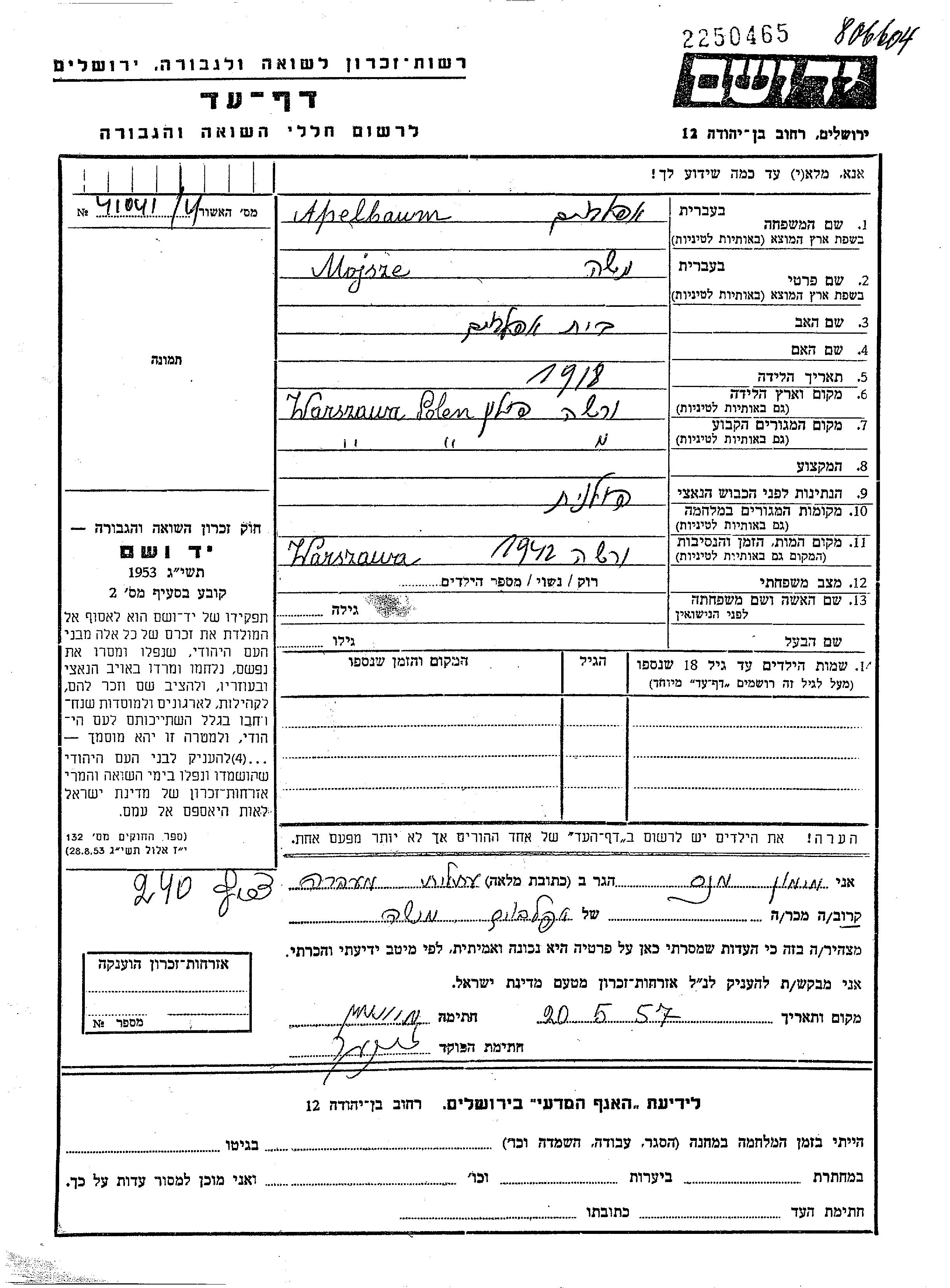 Apelbaum Mojsze 1918 Warszawa, Pologne Feuille de témoignage