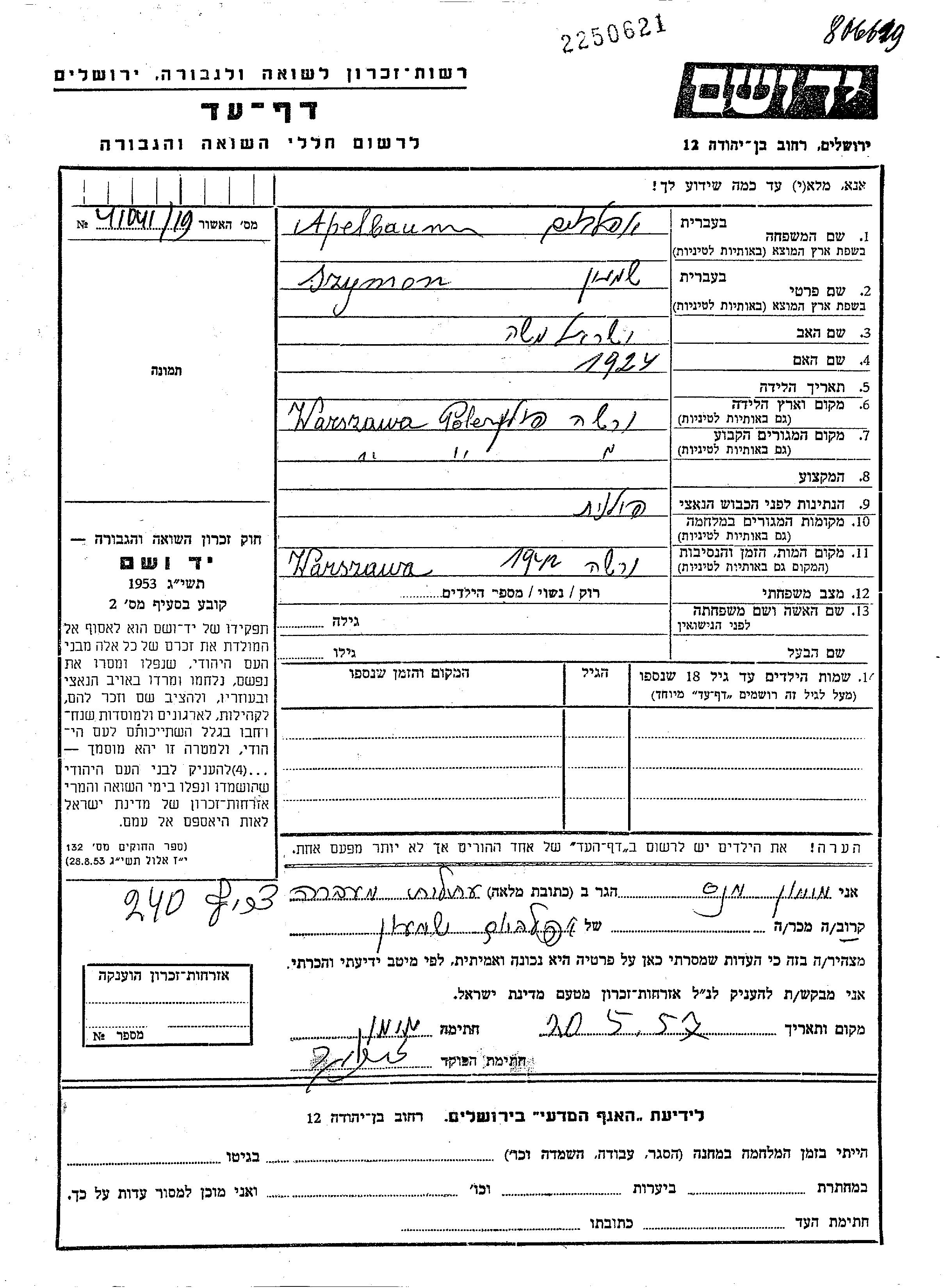 Apelbaum Szymon 1924 Warszawa, Pologne Feuille de témoignage