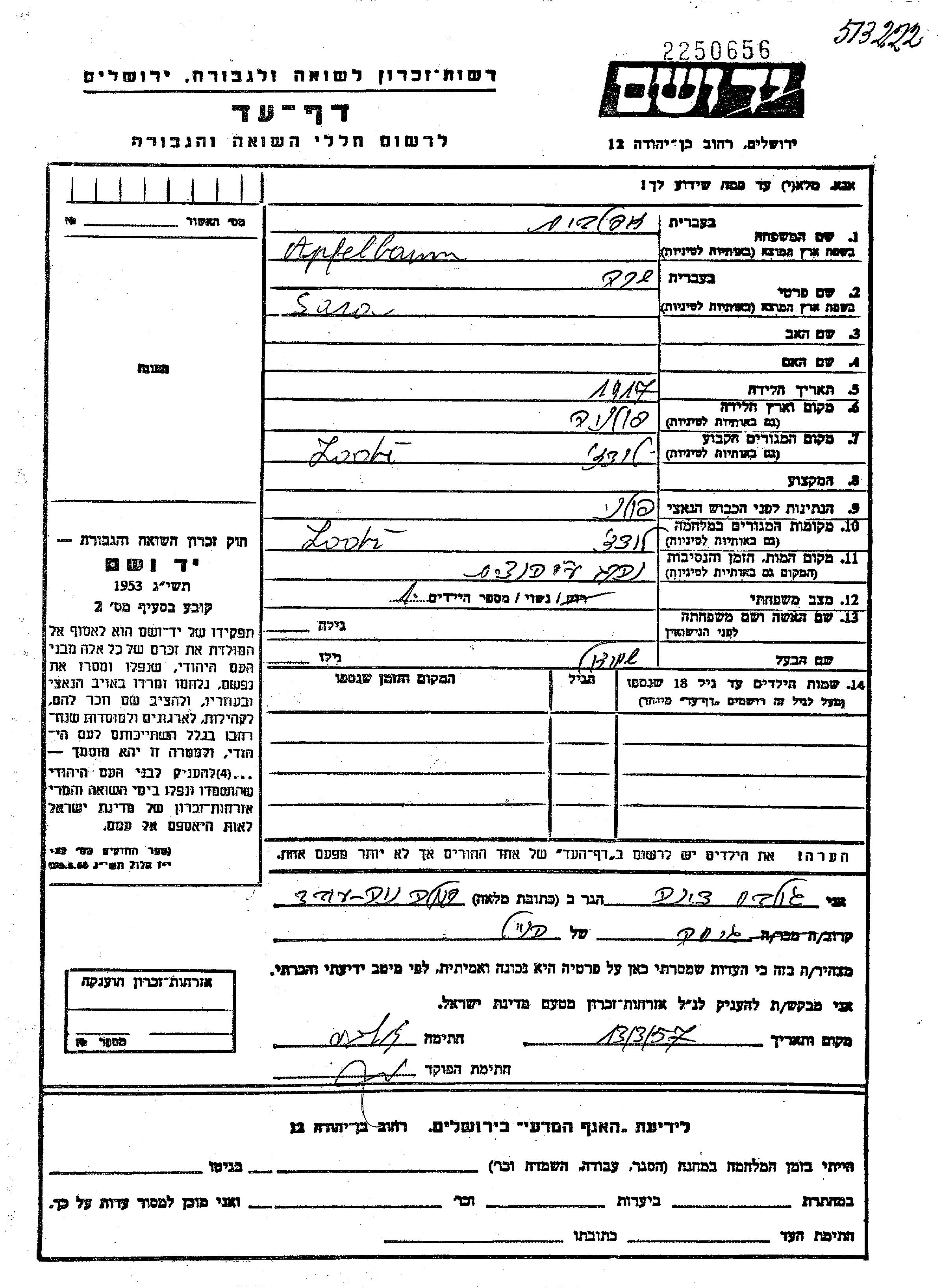 Apfelbaum Sara 1917 Lodz, Pologne Feuille de témoignage