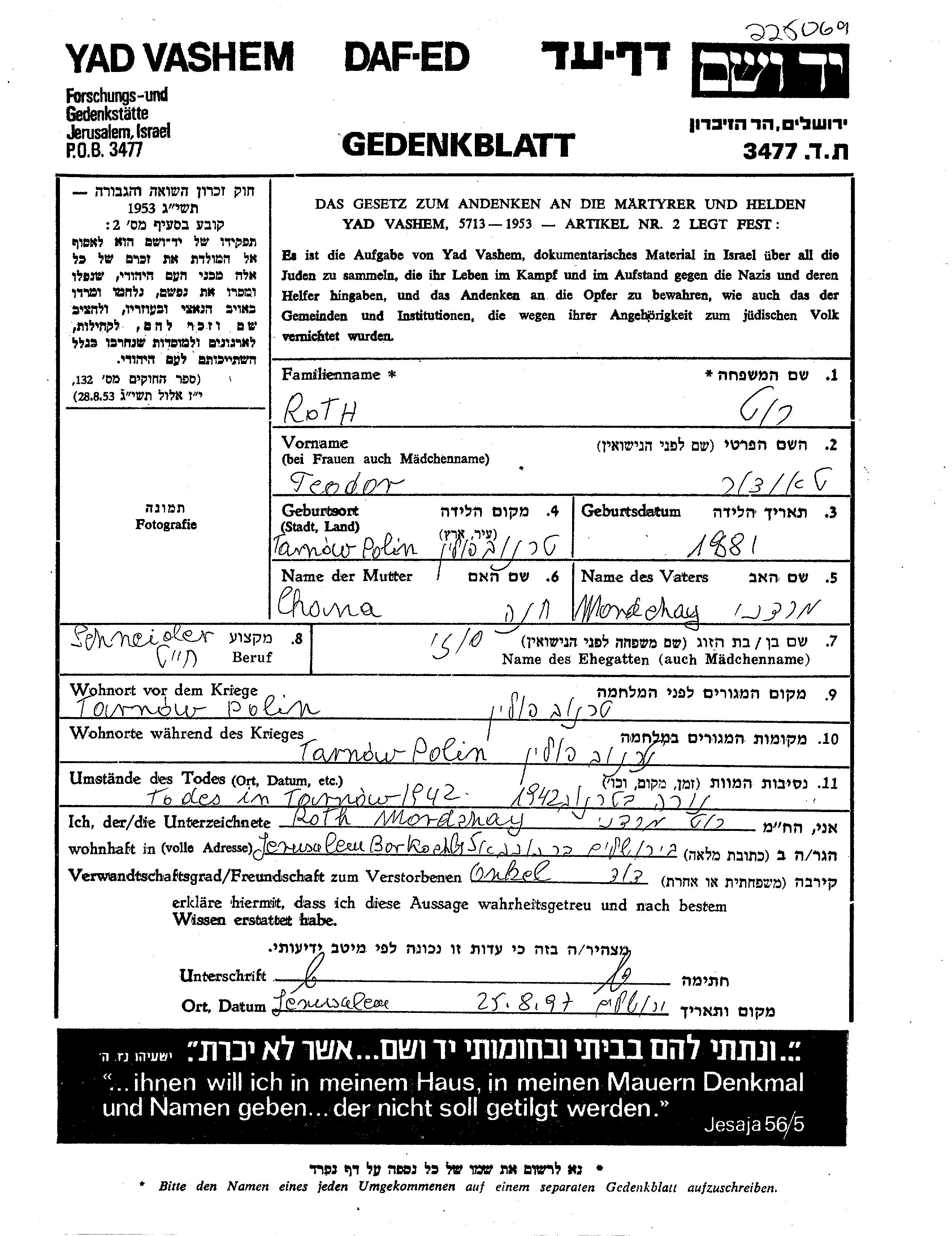 Teodor Roth Rut est né à Tarnow, Pologne en 1881, fils de Mordechay et de Chana. Il était Tailleur et Mariée à Suzi. Avant la seconde guerre mondiale il vivait à Tarnow, Pologne. Au cours de la guerre, il était à Tarnow, Pologne.