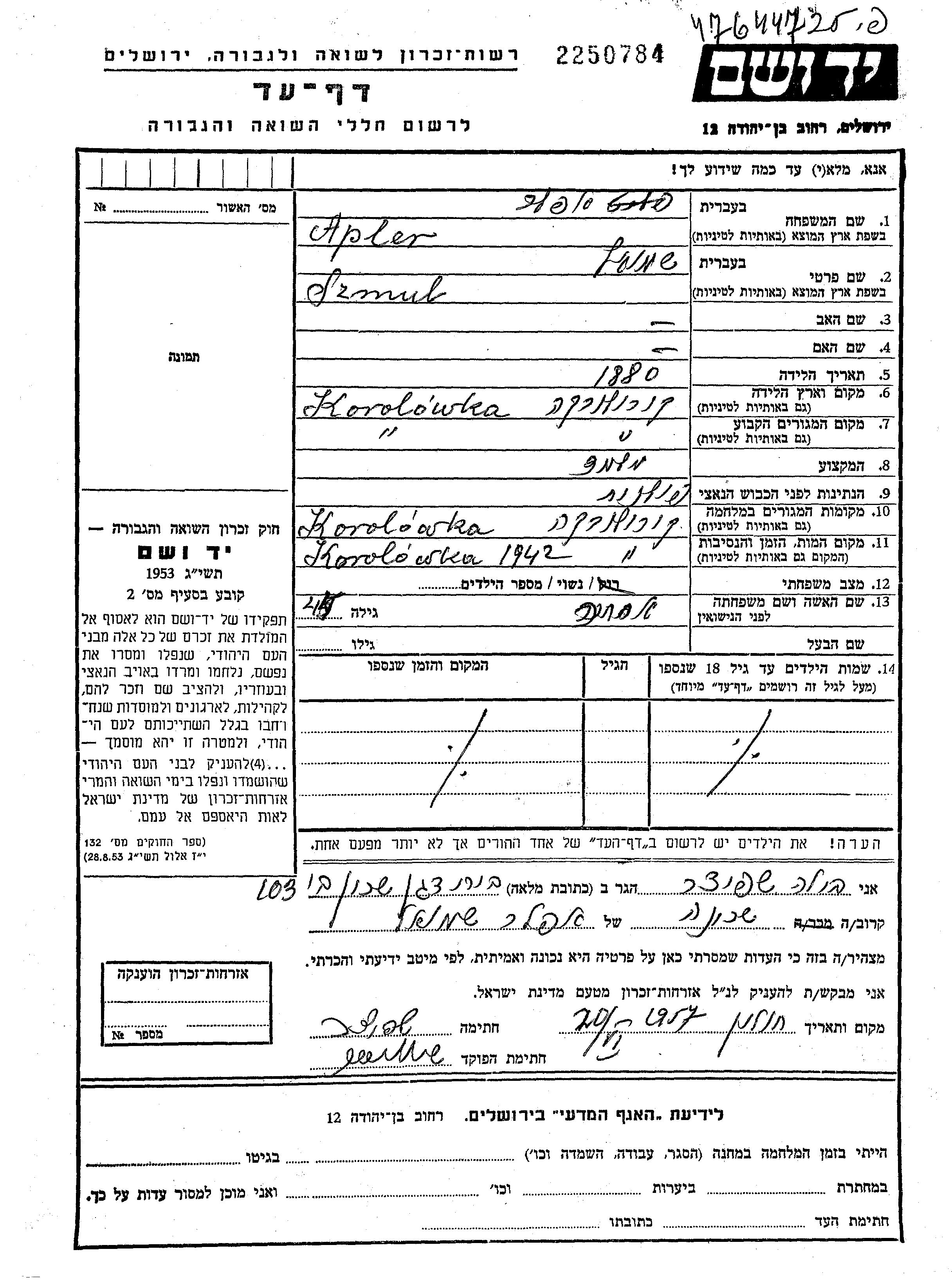 Apler Szmul 1880 Korolowka, Pologne Feuille de témoignage