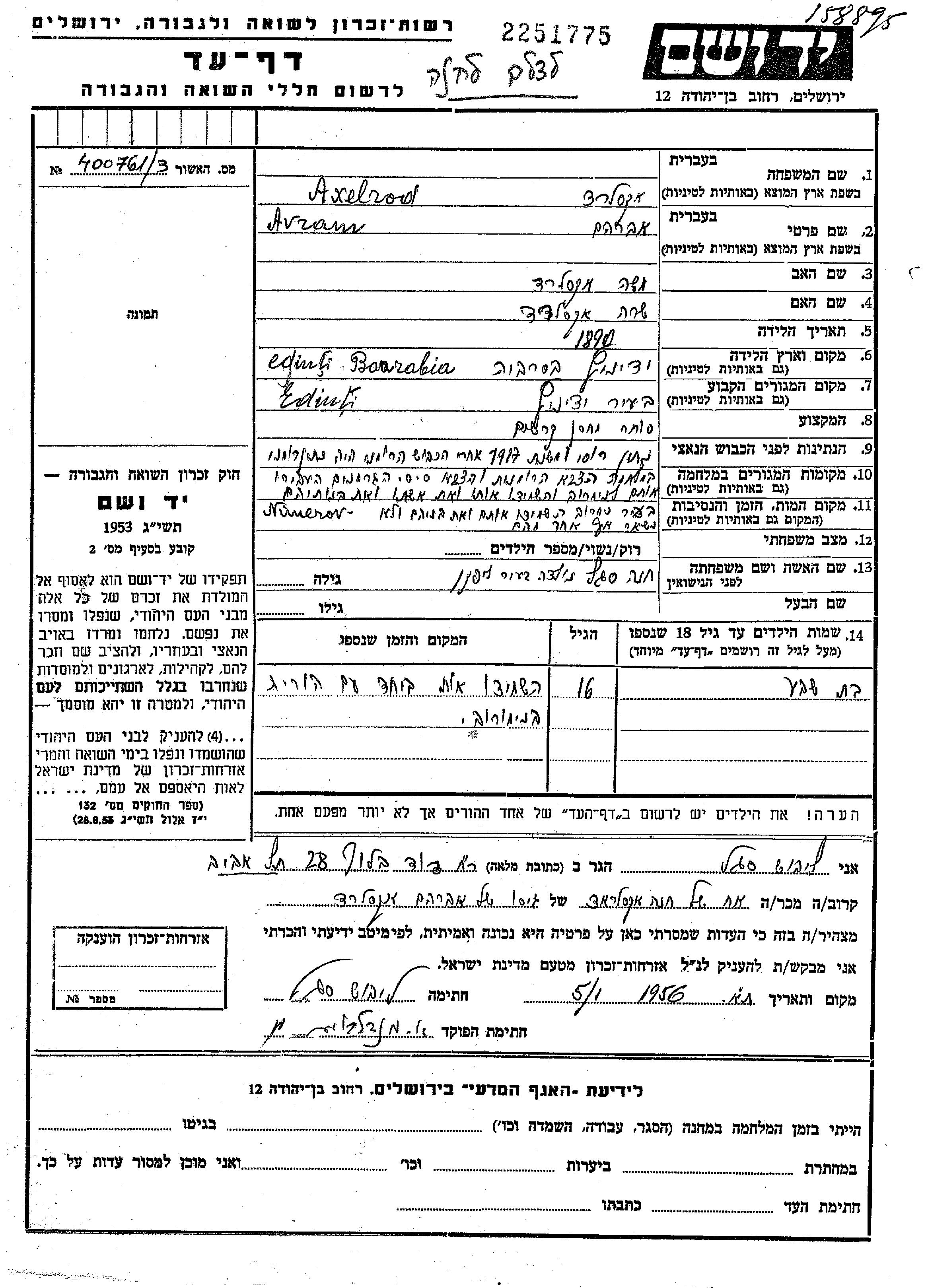 Axelrod Avram 1890 Edineţi, Roumanie Feuille de témoignage