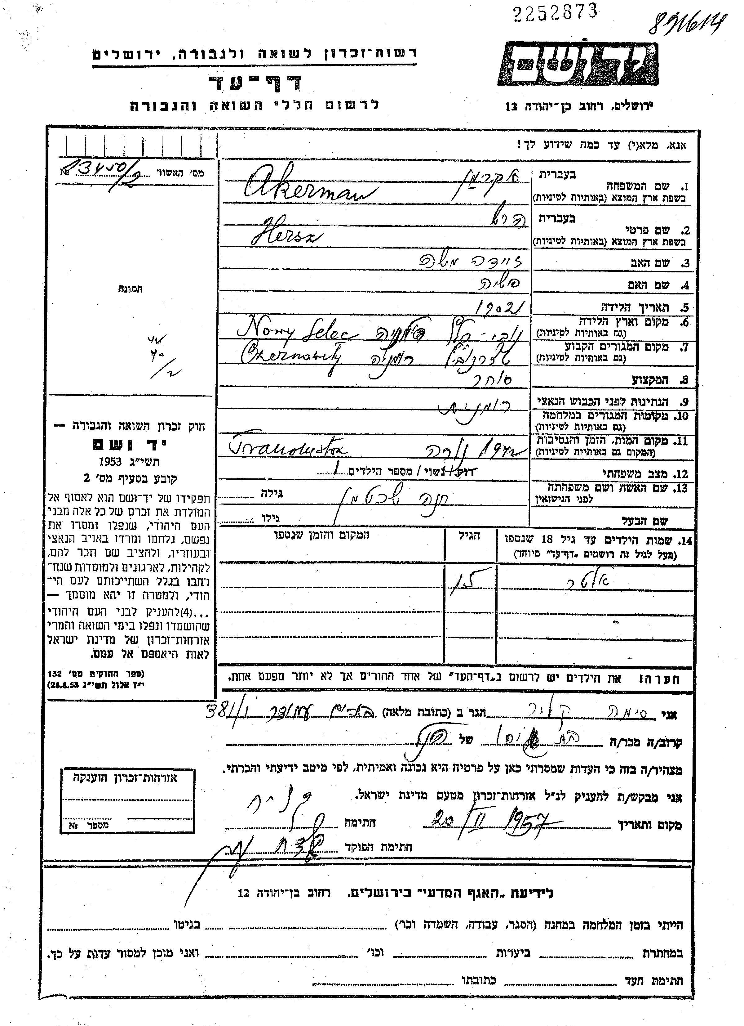 Akerman Hersz 1902 Czernowitz, Roumanie Feuille de témoignage