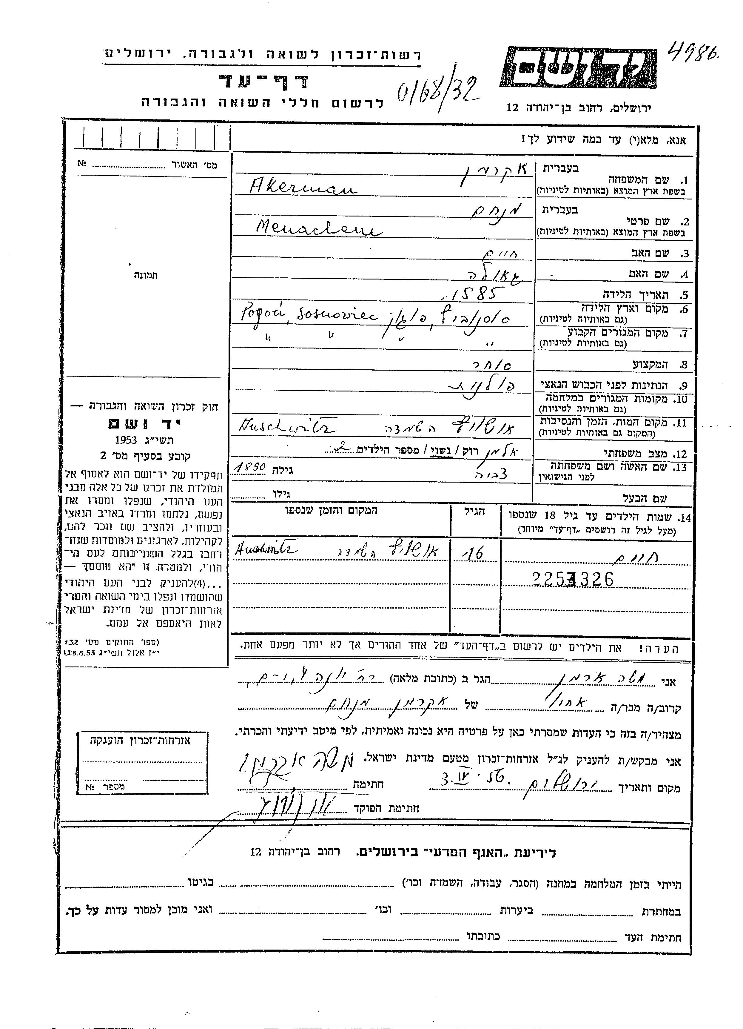 Khaim Akerman est né fils de Menachem et de Tzvia. Il était Élève et Enfant. Avant la seconde guerre mondiale il vivait à Sosnowiec, Pologne. Au cours de la guerre, il était à Pologne.