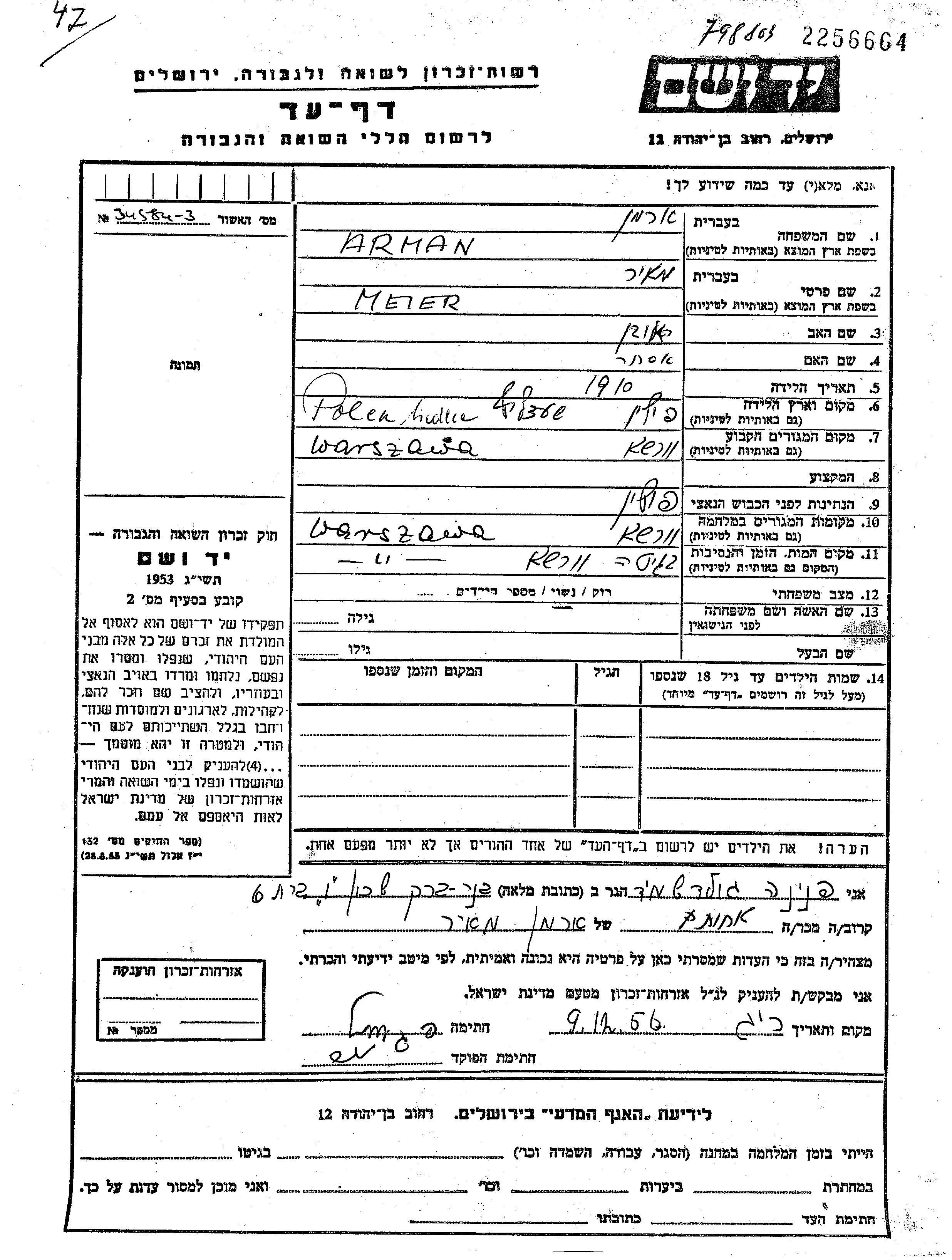 Arman Erman Meir 1910 Warszawa, Pologne Feuille de témoignage