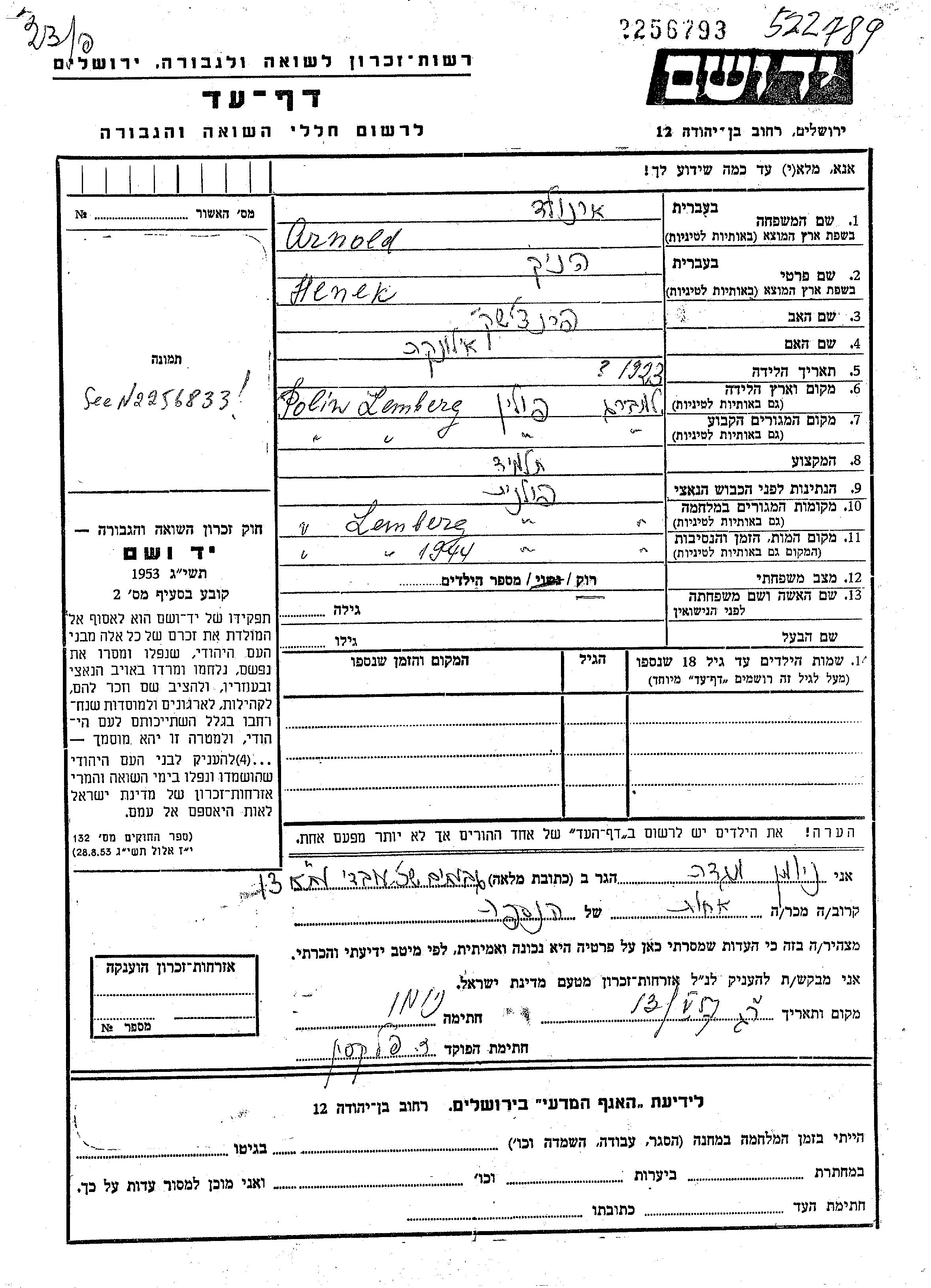 Arnold Henek Lemberg, Pologne Feuille de témoignage