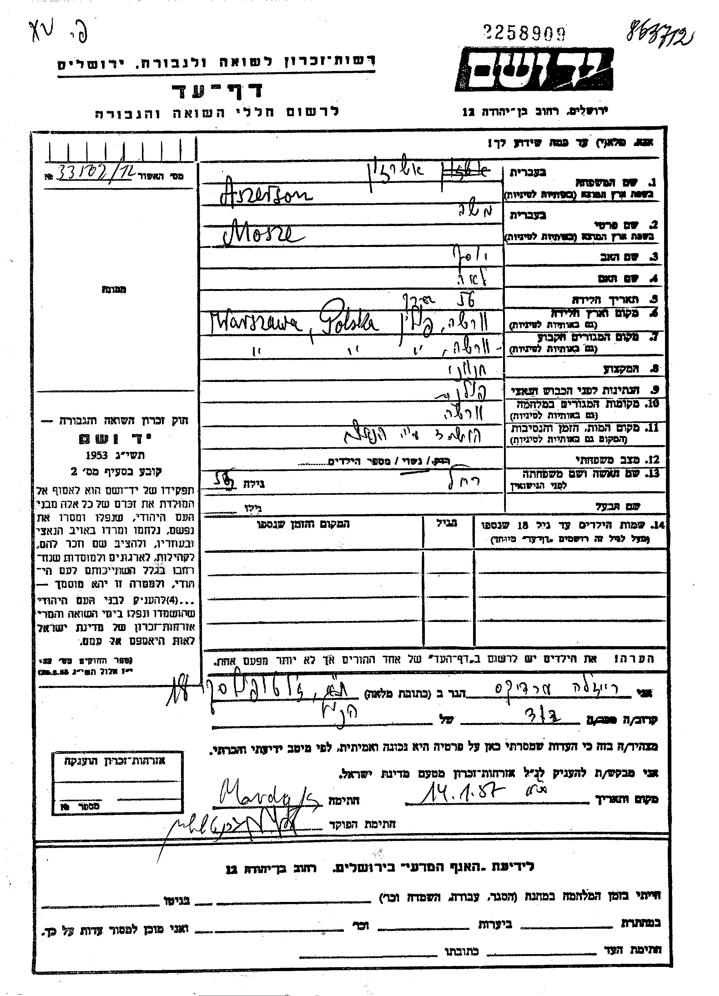 Aszerson Mosze Warszawa, Pologne Feuille de témoignage