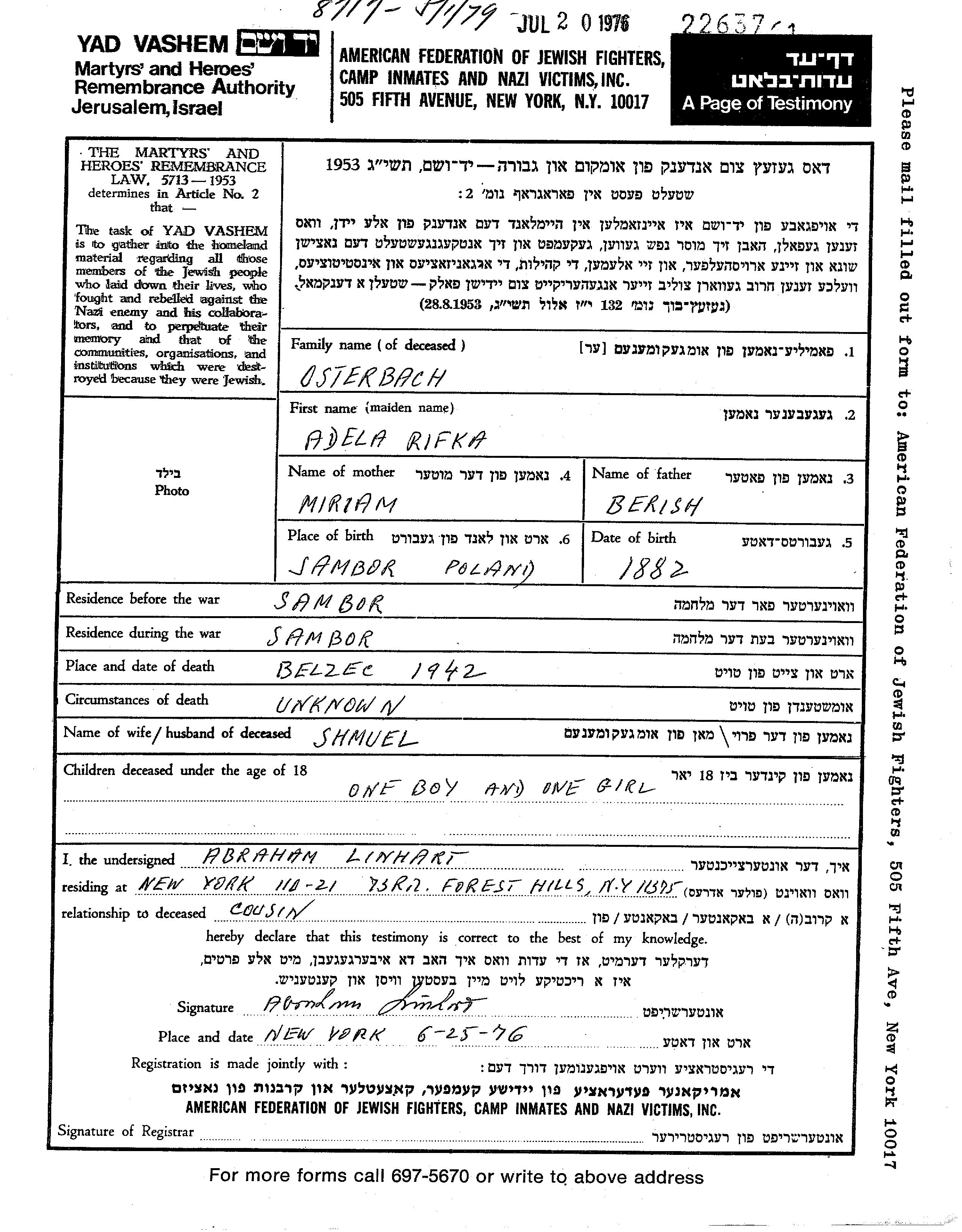 Osterbach Rivka Adela 1882 Sambor, Pologne Feuille de témoignage