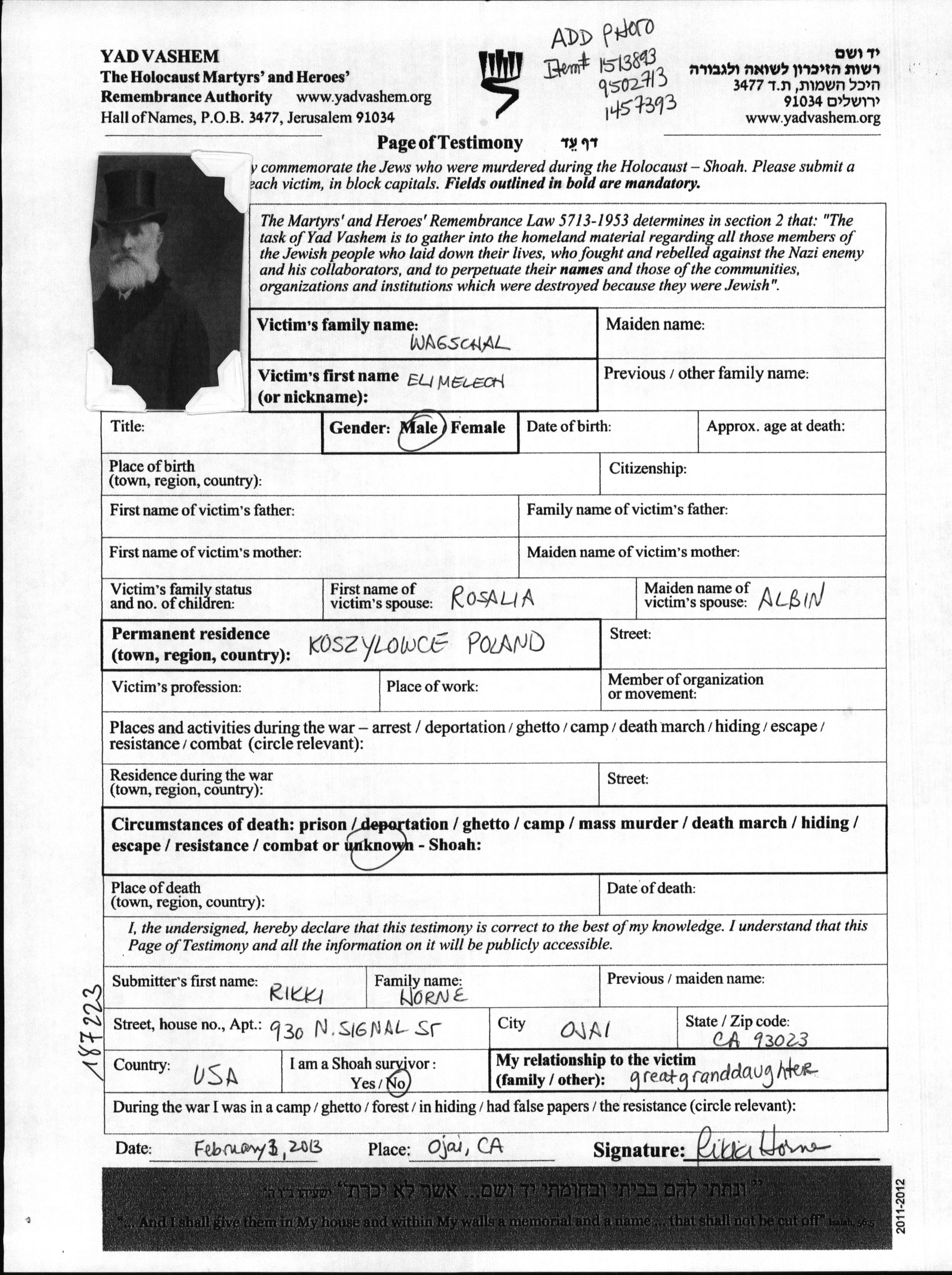 Wagschal Elimelech Koszylowce, Pologne Feuille de témoignage