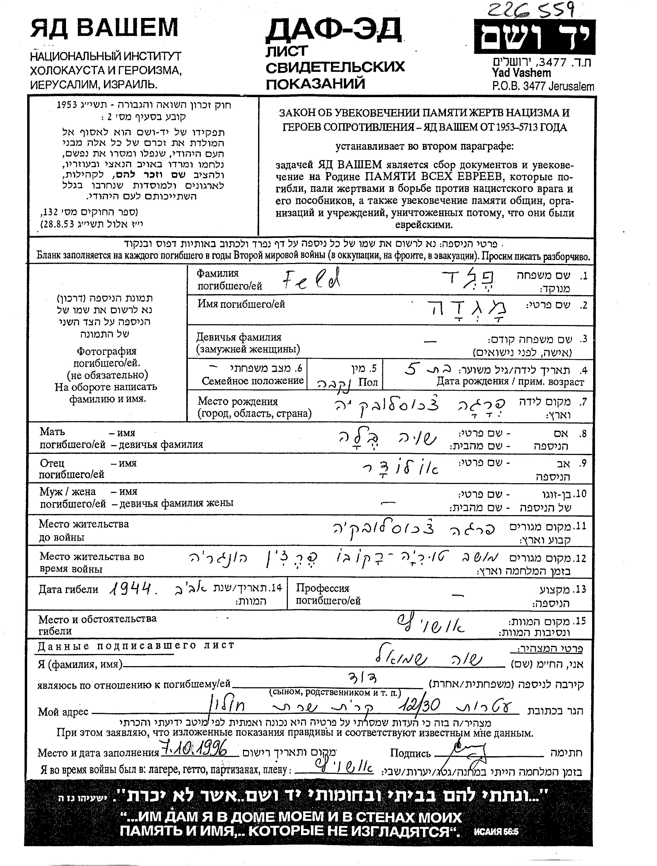 Yad Vashem - Pages of Testimony Names Memorial Collection