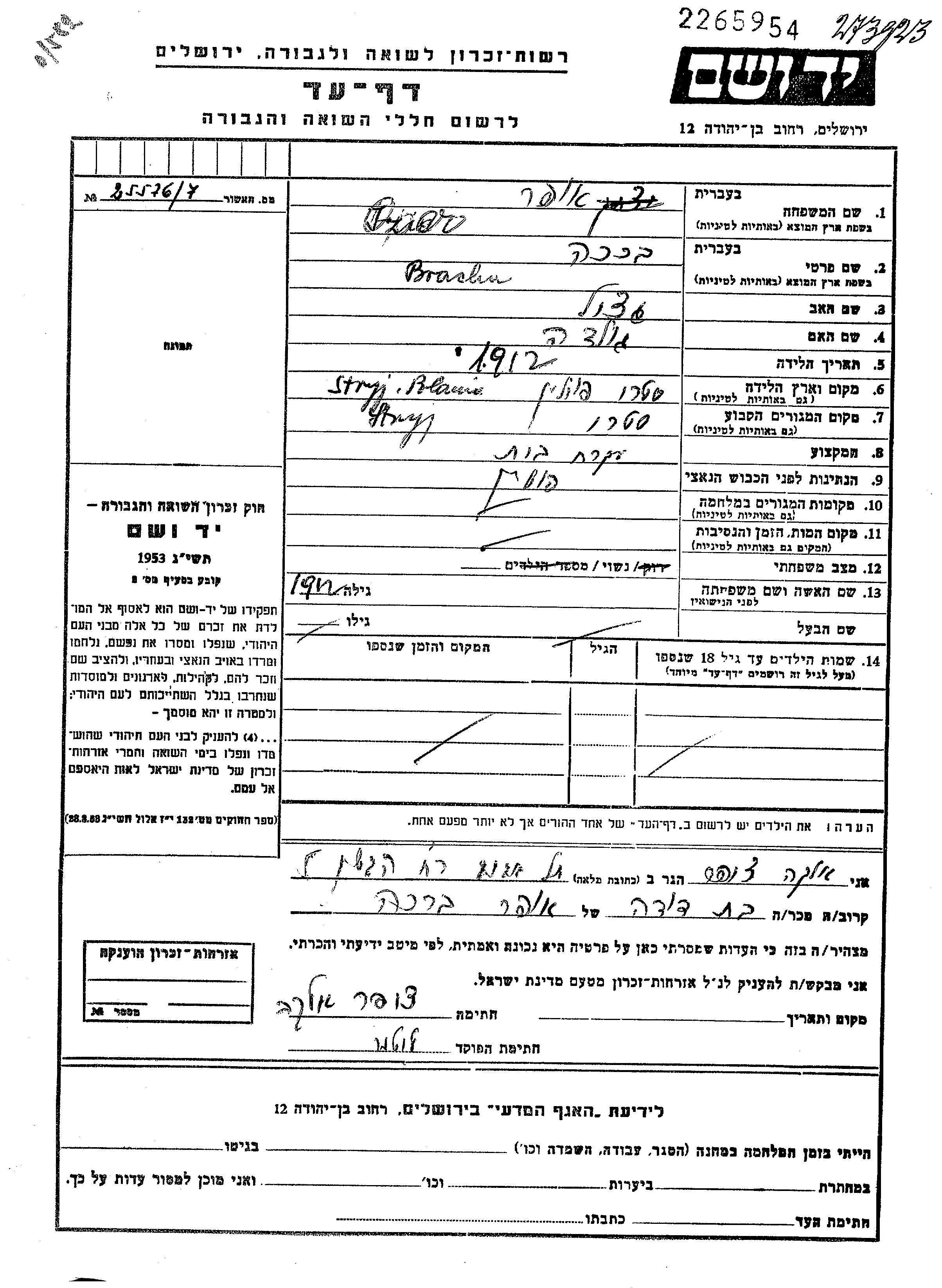 Ofer Bracha 1912 Stryj, Pologne Feuille de témoignage