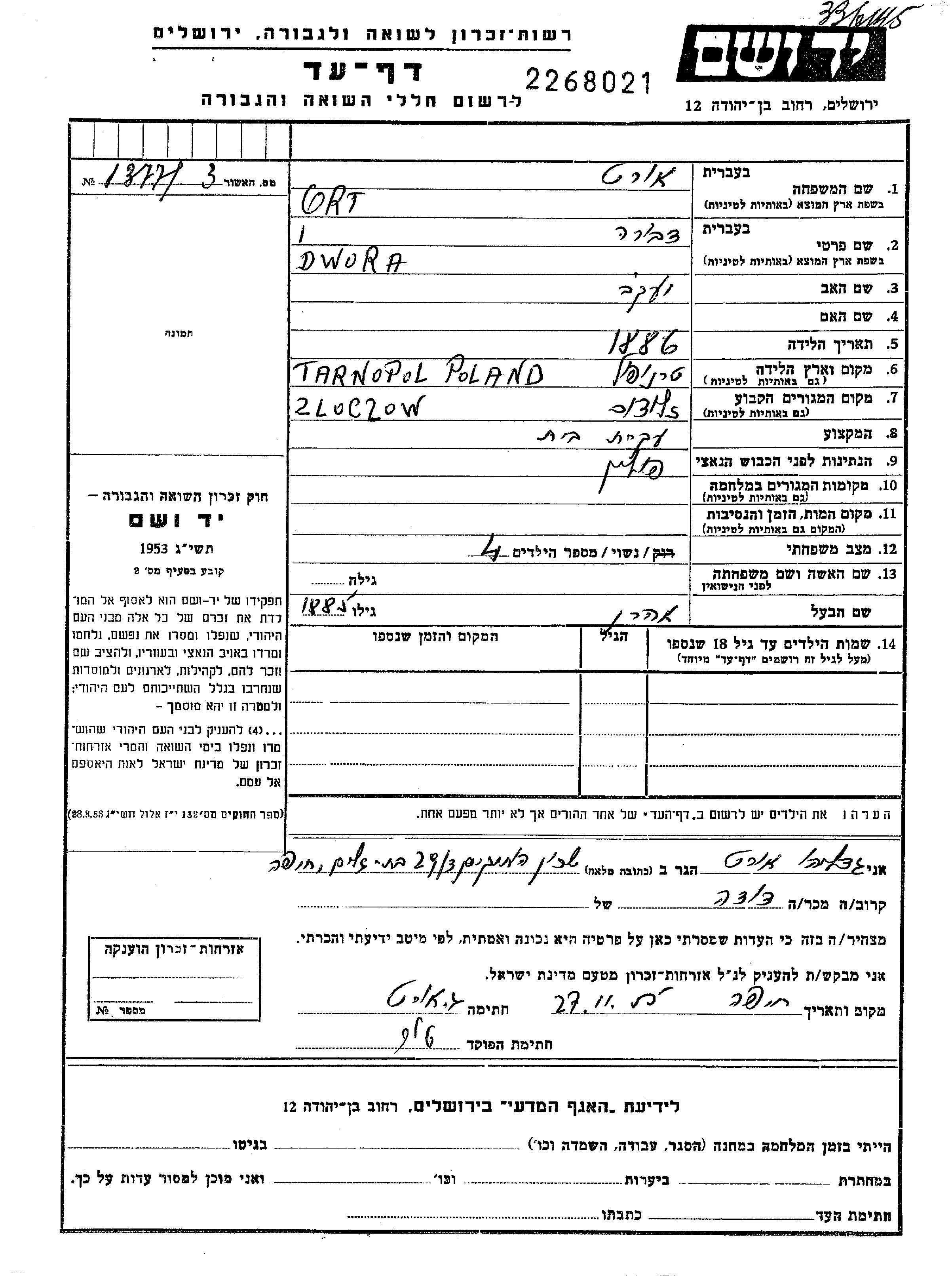 Dwora Ort est née à Tarnopol, Pologne en 1886, fille de Yaakov. Elle était Femme au foyer et Mariée à Ahron. Avant la seconde guerre mondiale elle vivait à Zloczow, Pologne.