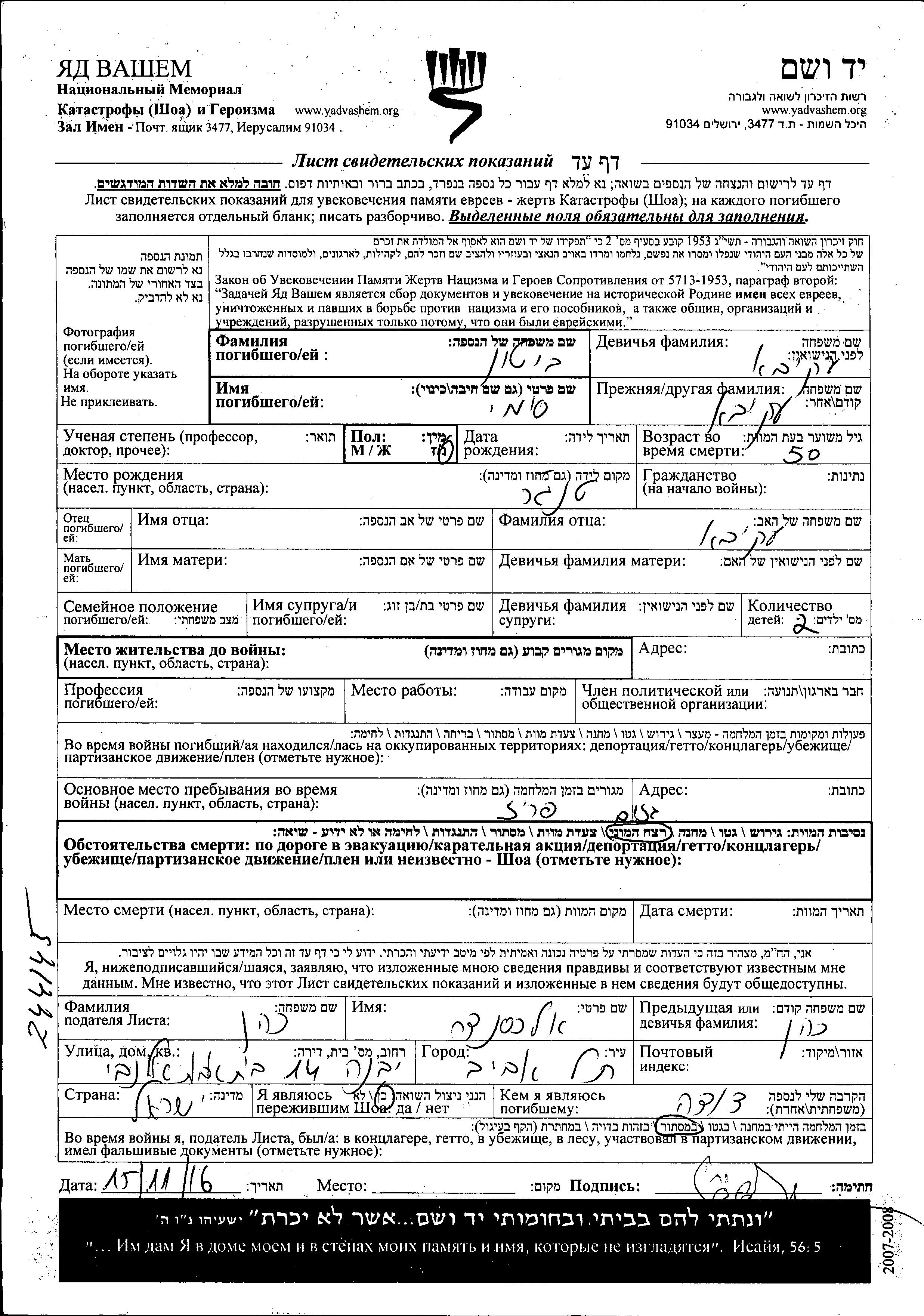Yad Vashem - Pages of Testimony Names Memorial Collection