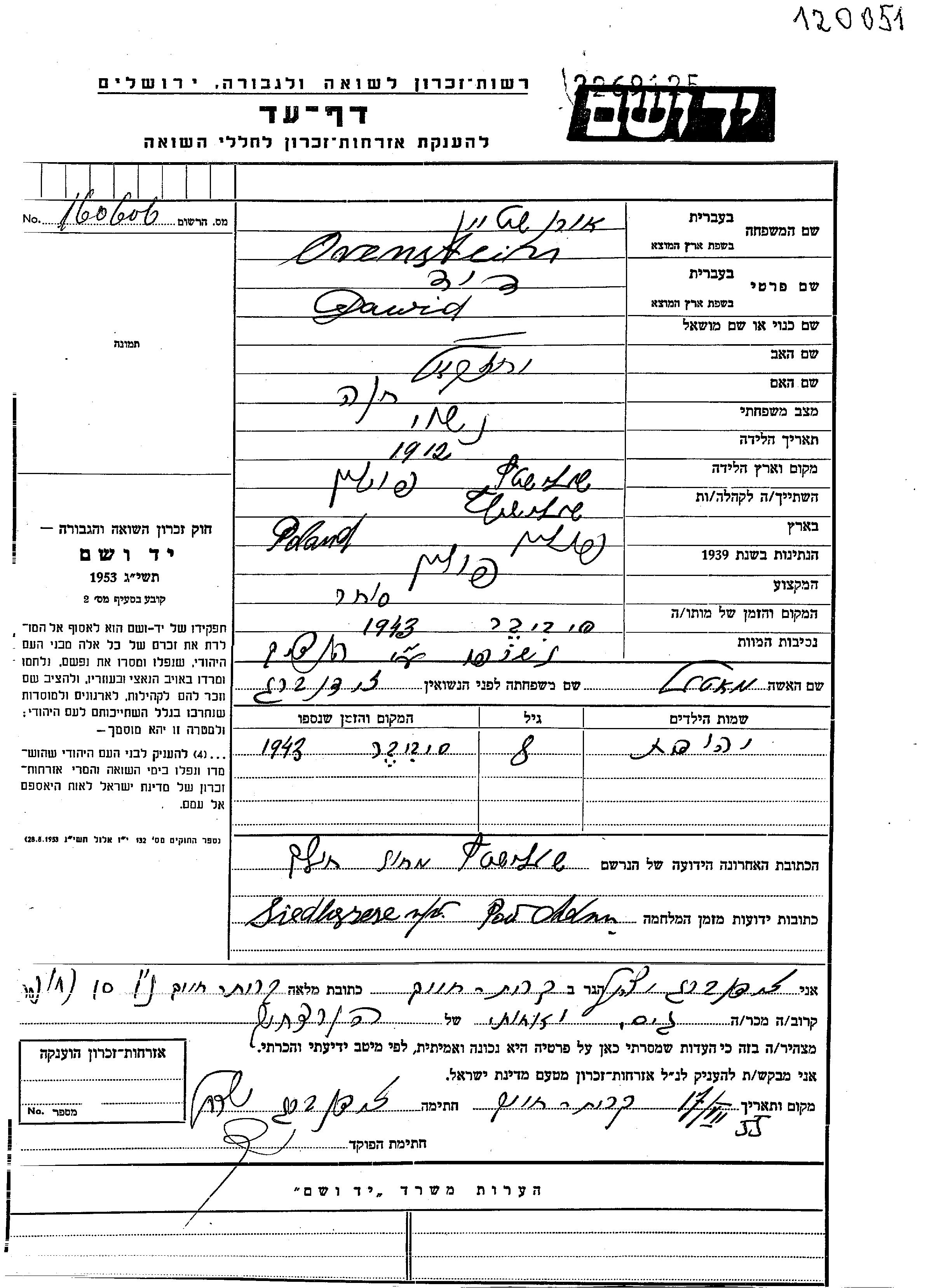 Orenstein Dawid 1912 Siedlce, Pologne Feuille de témoignage