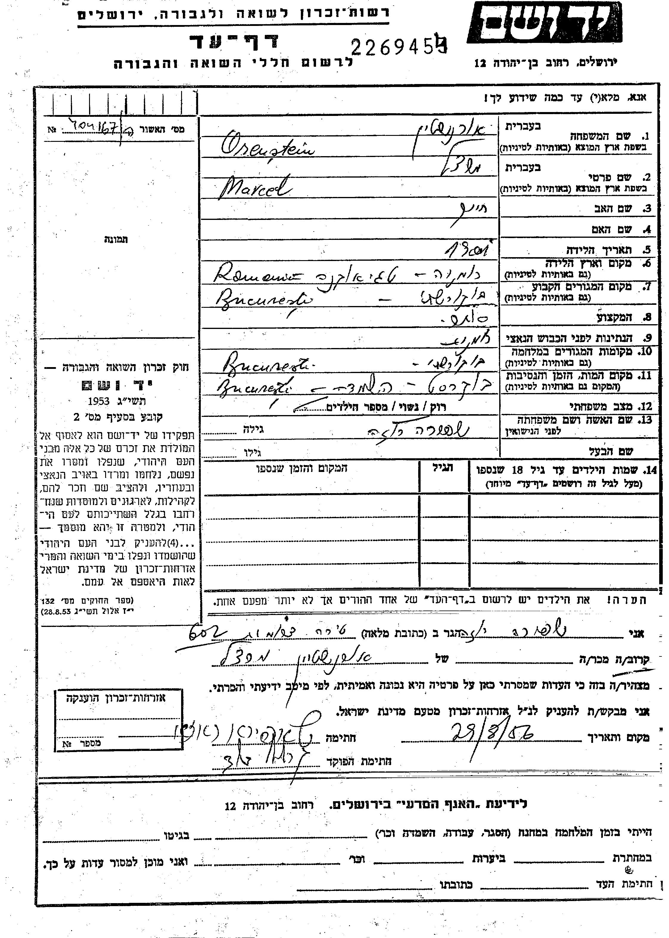 Orenstein Marcel 1901 Bucuresti, Roumanie Feuille de témoignage