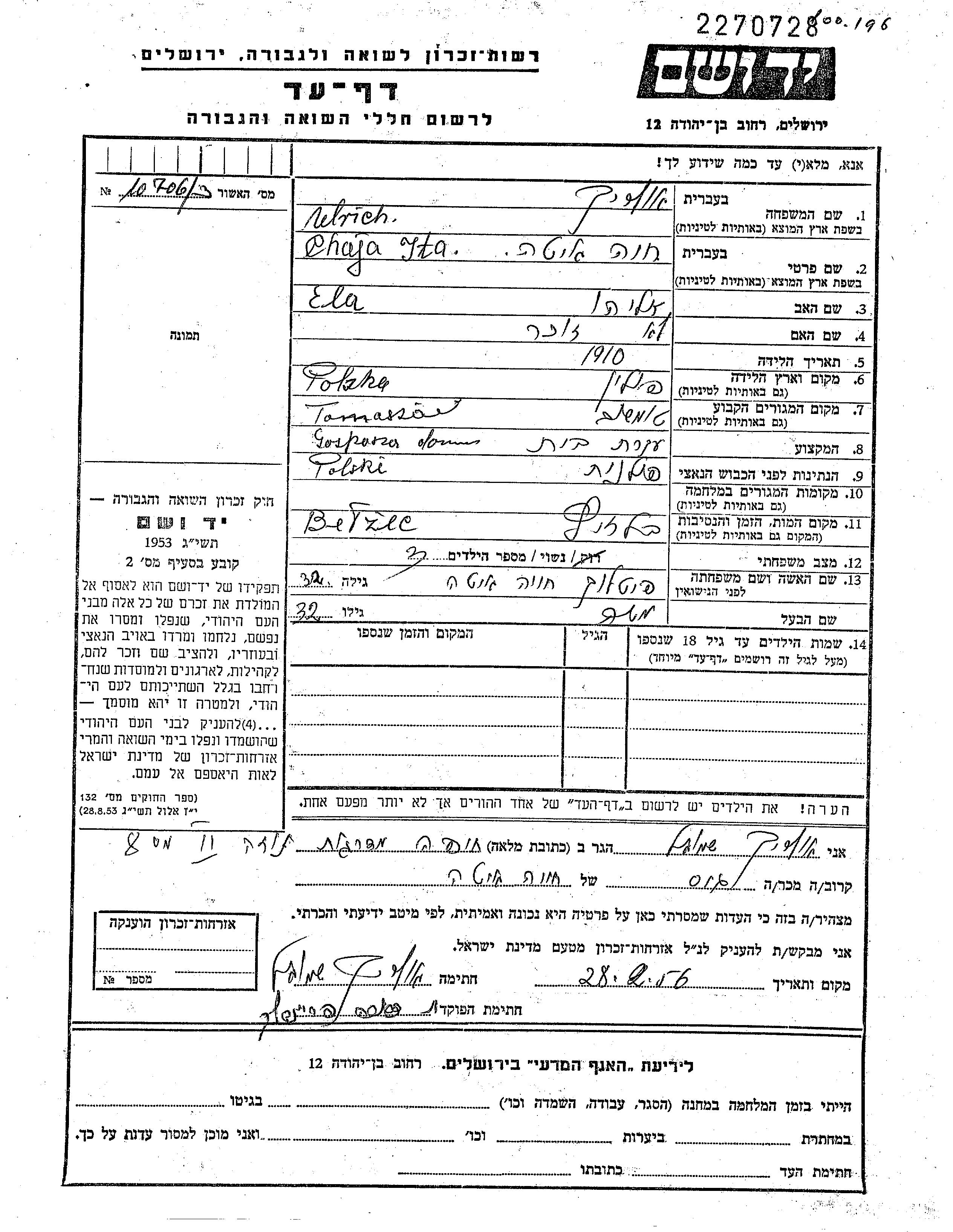 Ulrich Chaja Ita 1910 Tomaszow, Pologne Feuille de témoignage