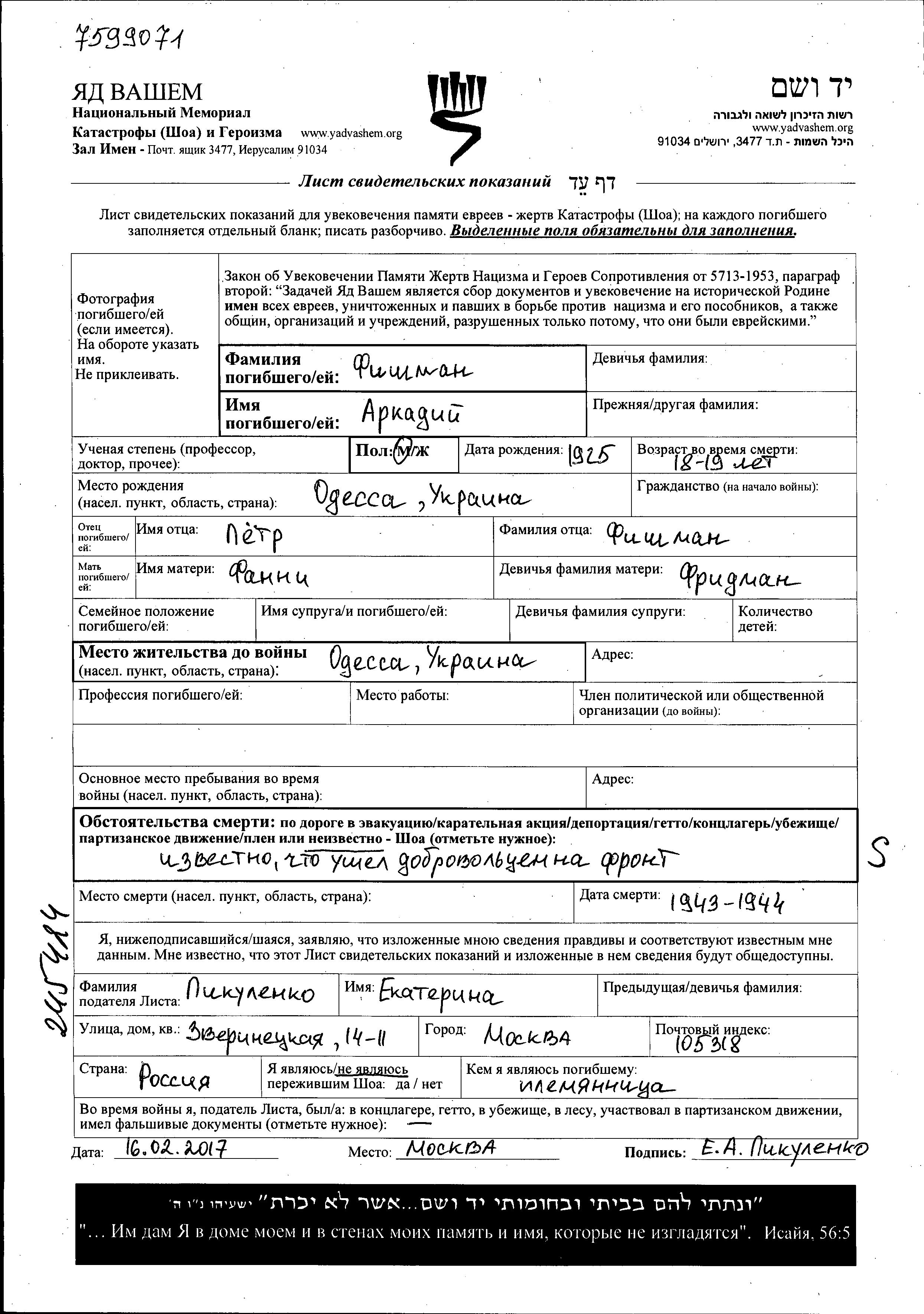 Arkadiy Fishman est né à Odessa, Ukraine (URSS) en 1925, fils de Pyotr et de Fanni née Fridman. Avant la seconde guerre mondiale il vivait à Odessa, Ukraine (URSS). Au cours de la guerre, il était à the Soviet armed forces. Arkadiy a été tué en tant que militaire pendant la Seconde Guerre mondiale. Lieu de la mort: endroit inconnu en 1943.