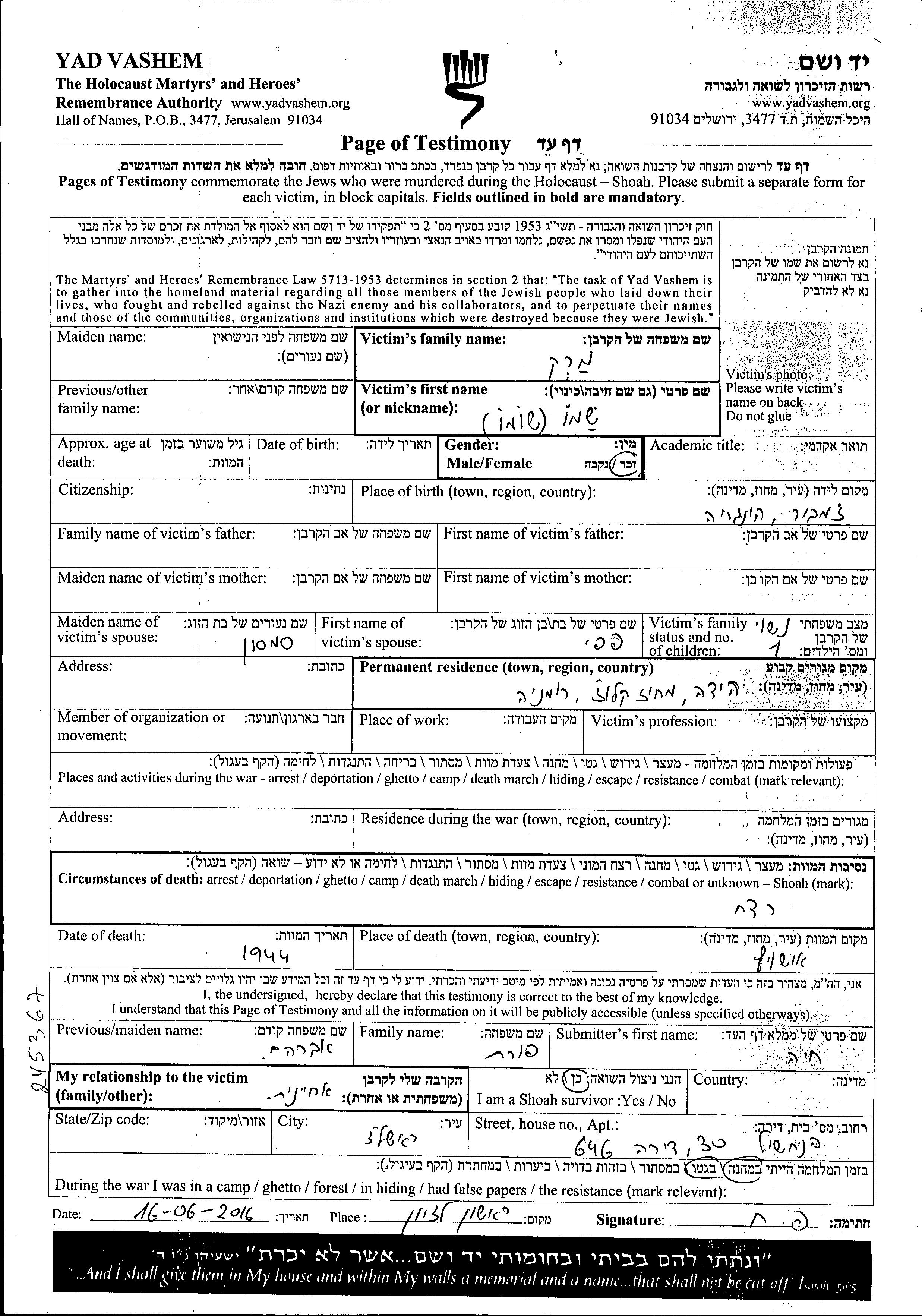 Yad Vashem - Pages of Testimony Names Memorial Collection