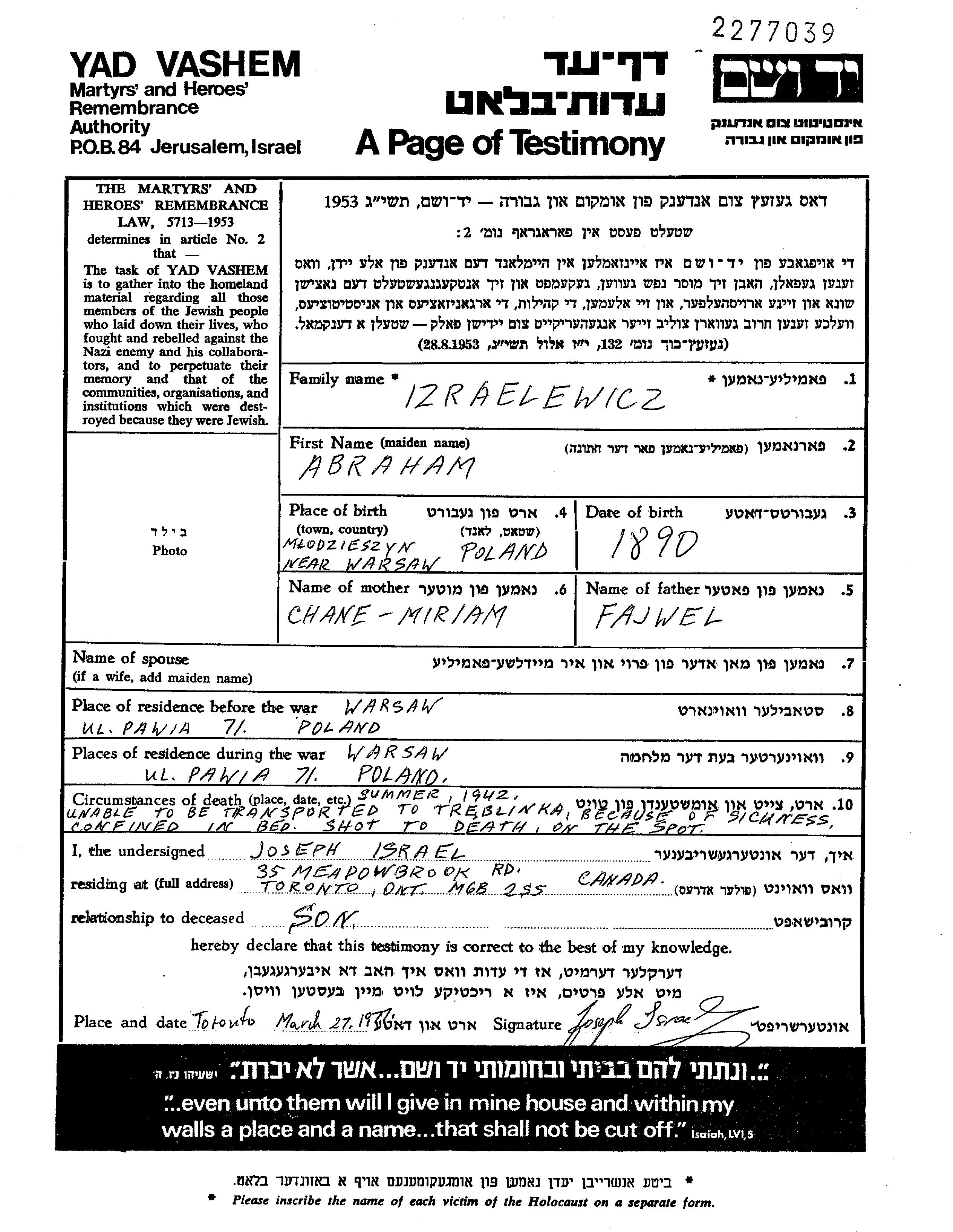 Abraham Izraelewicz est né à Mlodzieszyn, Pologne en 1890, fils de Faiwel et de Chane Miriam. Avant la seconde guerre mondiale il vivait à Warszawa, Pologne. Au cours de la guerre, il était à Warszawa, Pologne.