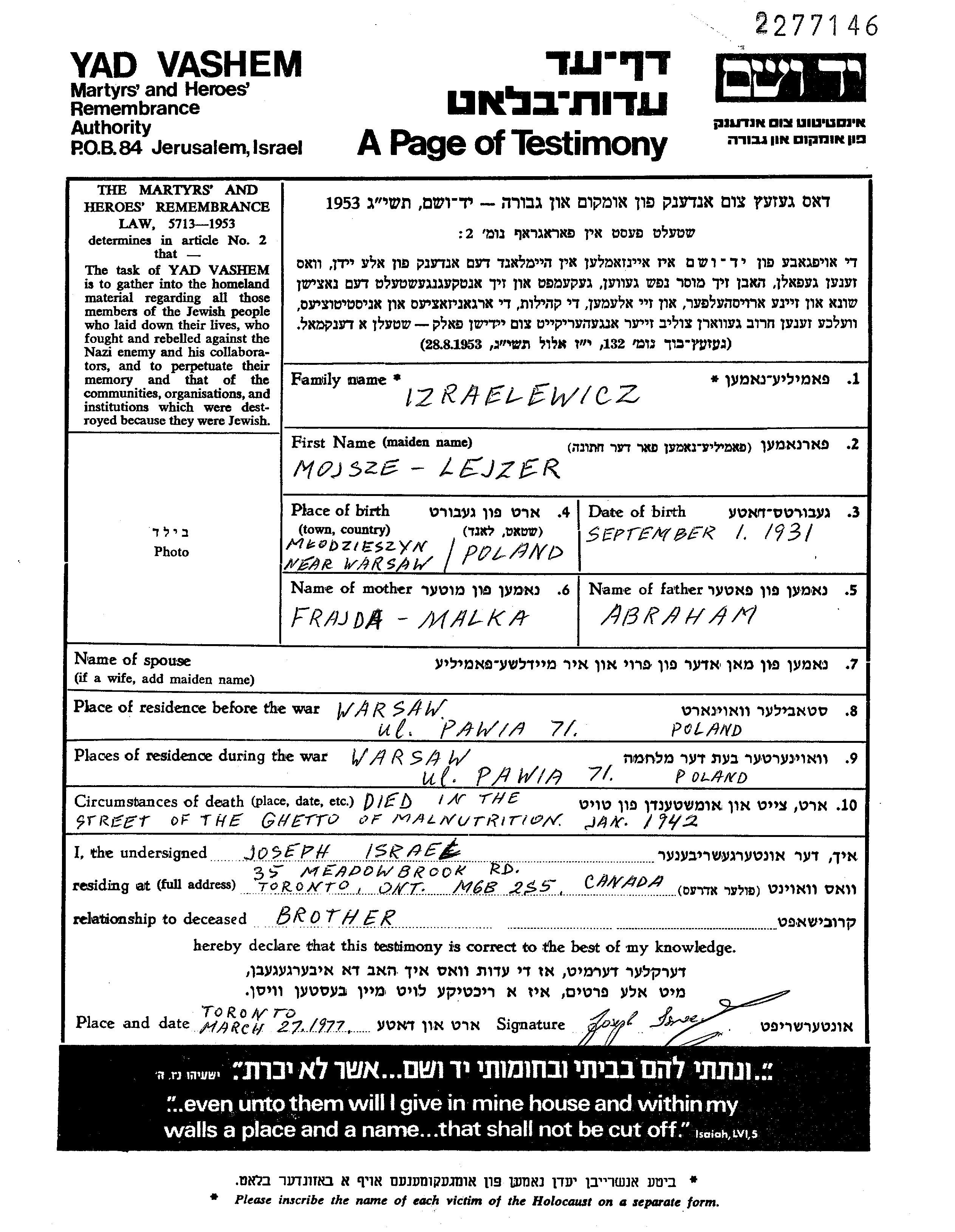 Izraelewicz Mojsze Lejzer 1931 Warszawa, Pologne Feuille de témoignage