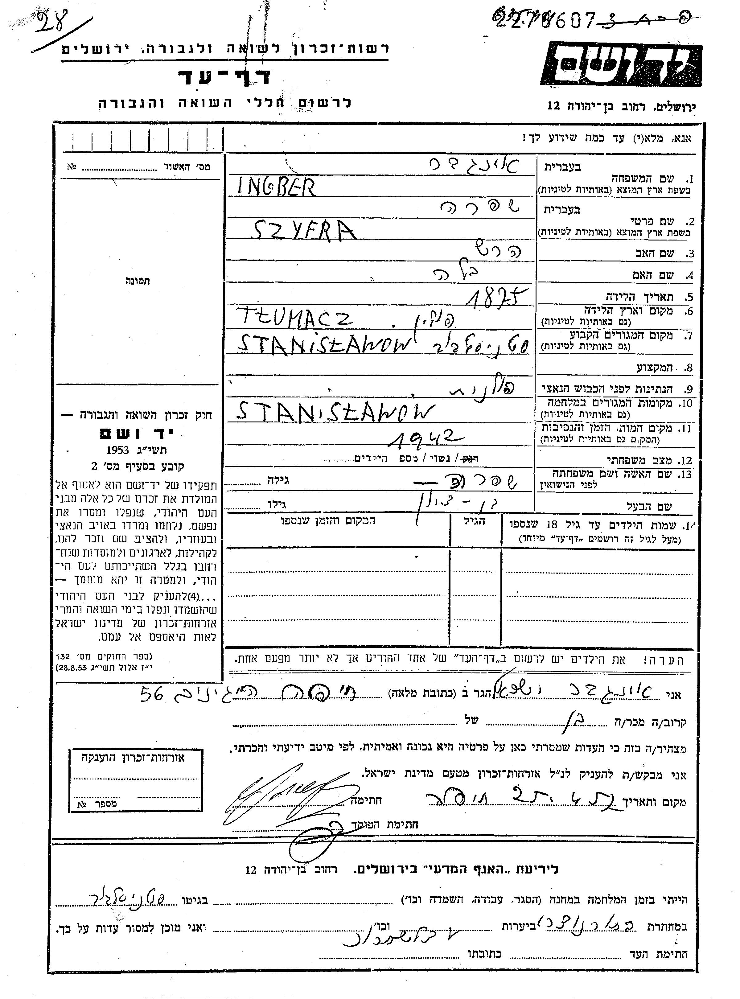 Ingber Szyfra 1875 Stanislawow, Pologne Feuille de témoignage