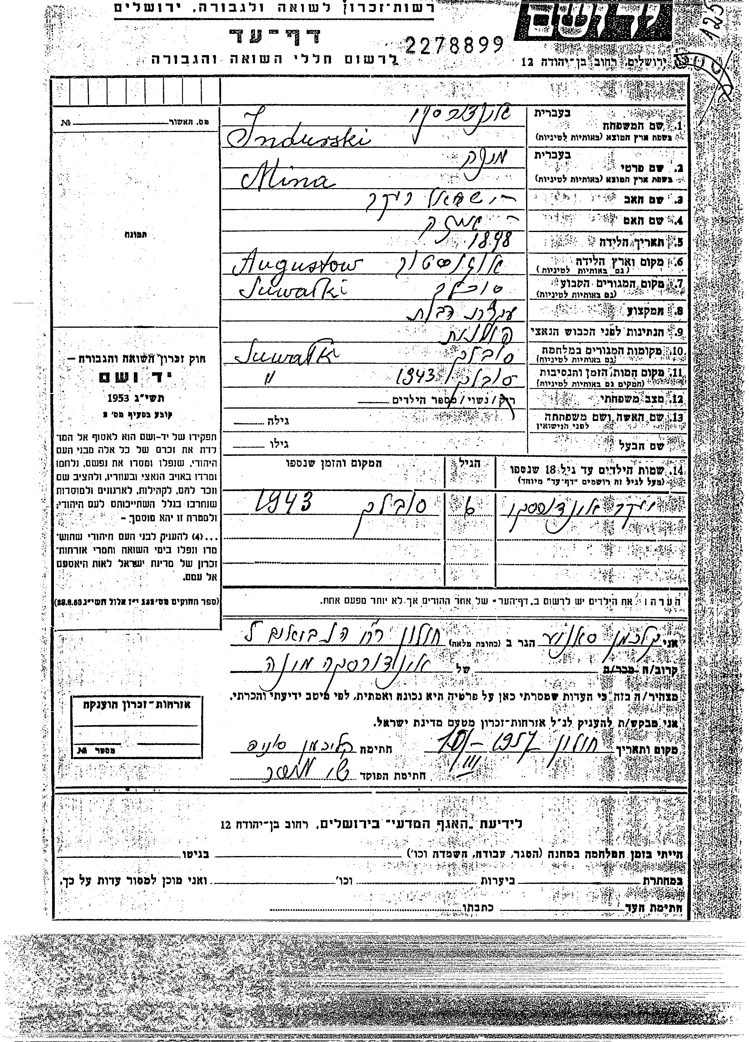 Yaakov Indurski est né à Suwalki, Pologne, fils de Mina. Il était Enfant. Avant la seconde guerre mondiale il vivait à Suwalki, Pologne. Au cours de la guerre, il était à Suwalki, Pologne.