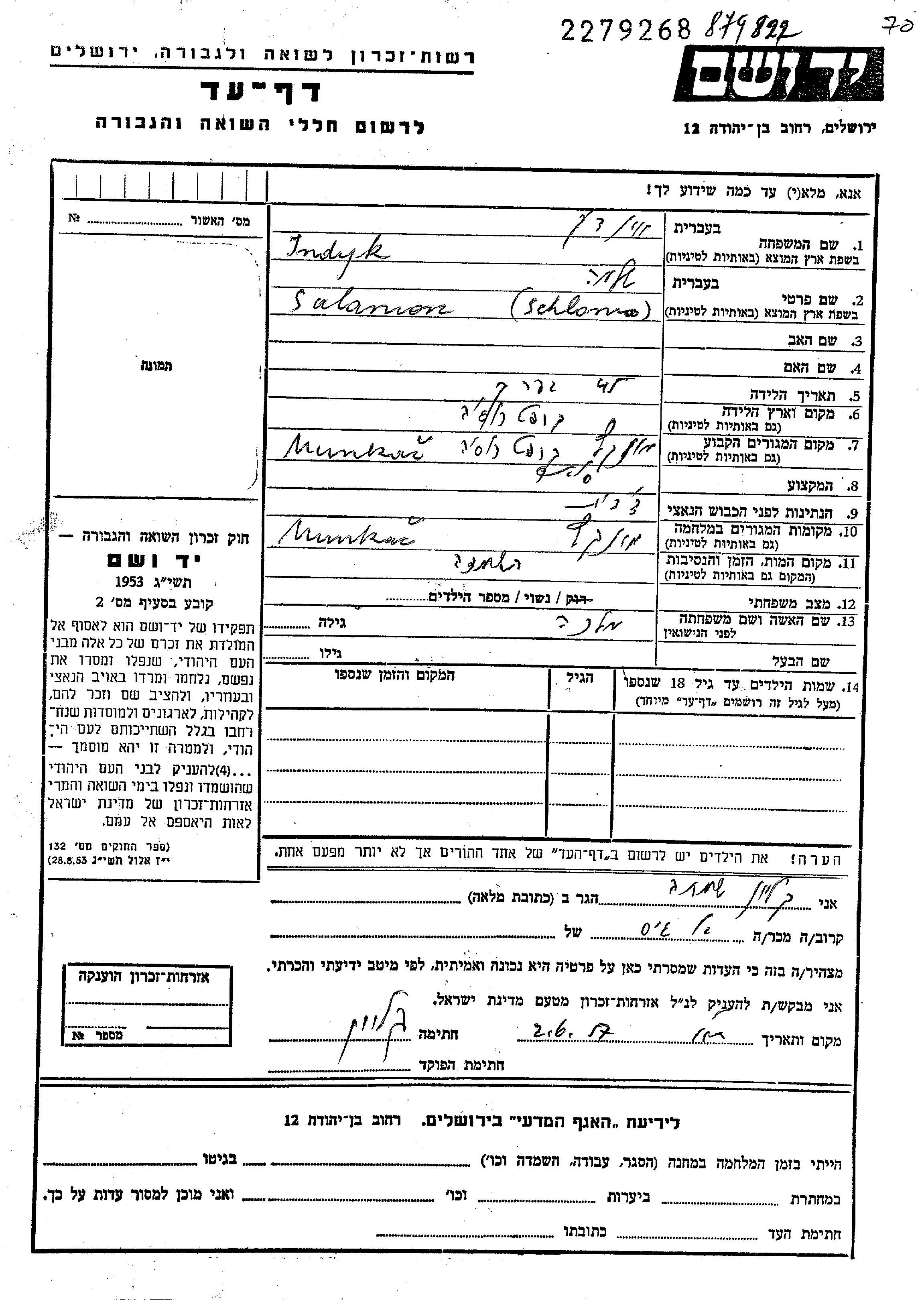 Indyk Salamon Munkacs, Tchécoslovaquie Feuille de témoignage