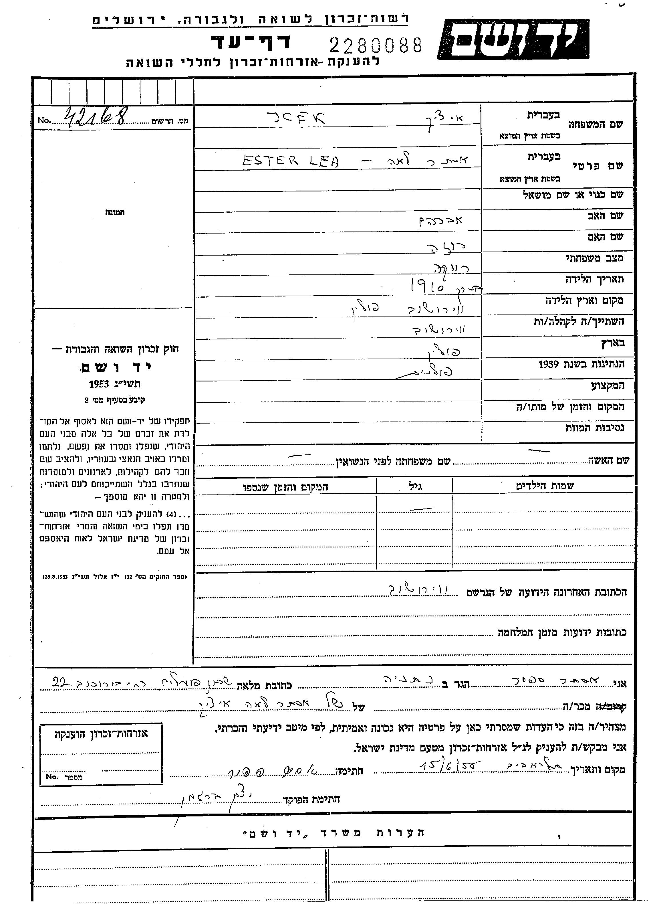 Icek Itzik Lea Ester 1910 Wieruszow, Pologne Feuille de témoignage