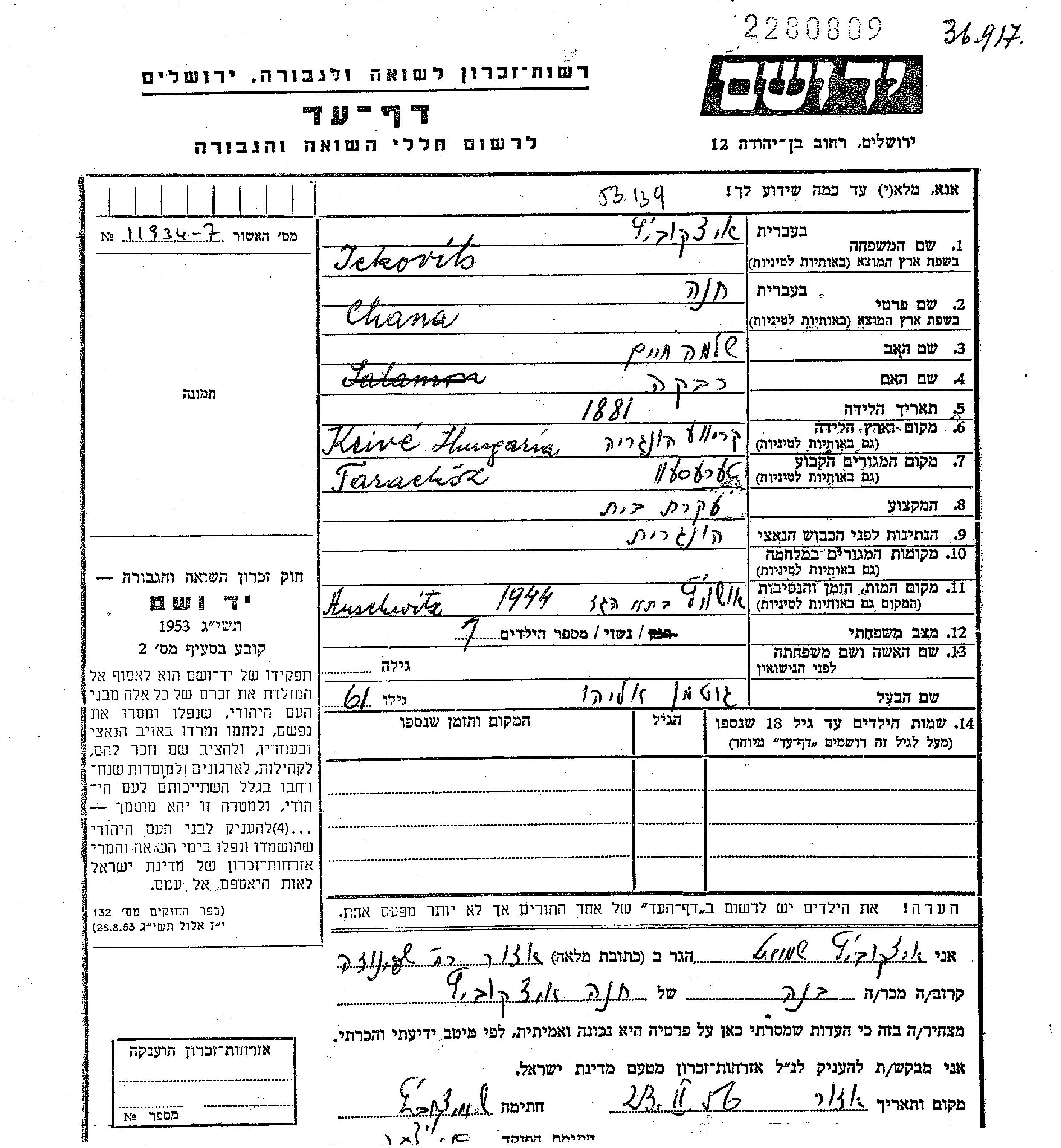 Ickovits Chana 1881 Teresva, Tchécoslovaquie Feuille de témoignage