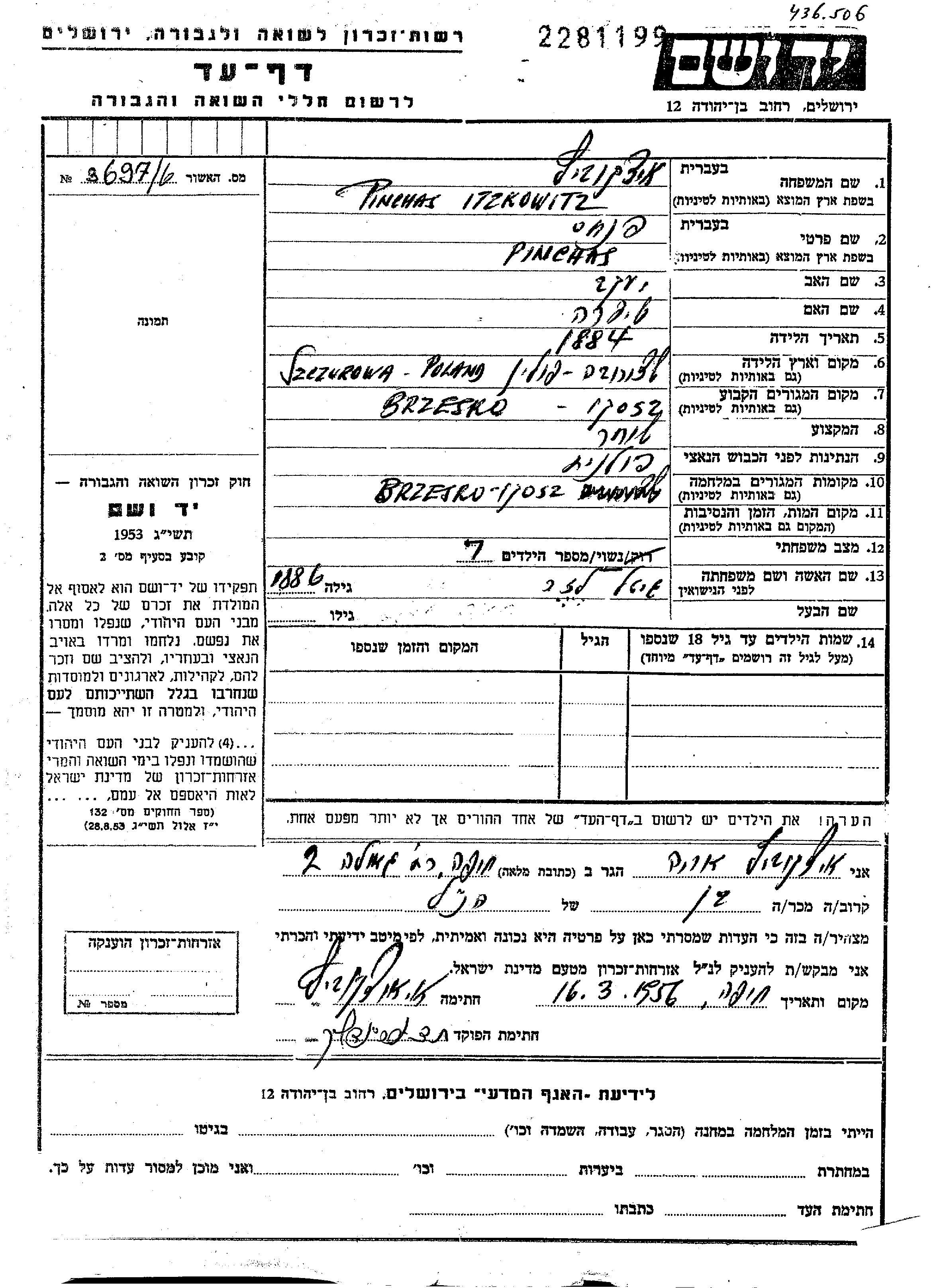 Itzkowitz Pinchas 1884 Brzesko, Pologne Feuille de témoignage