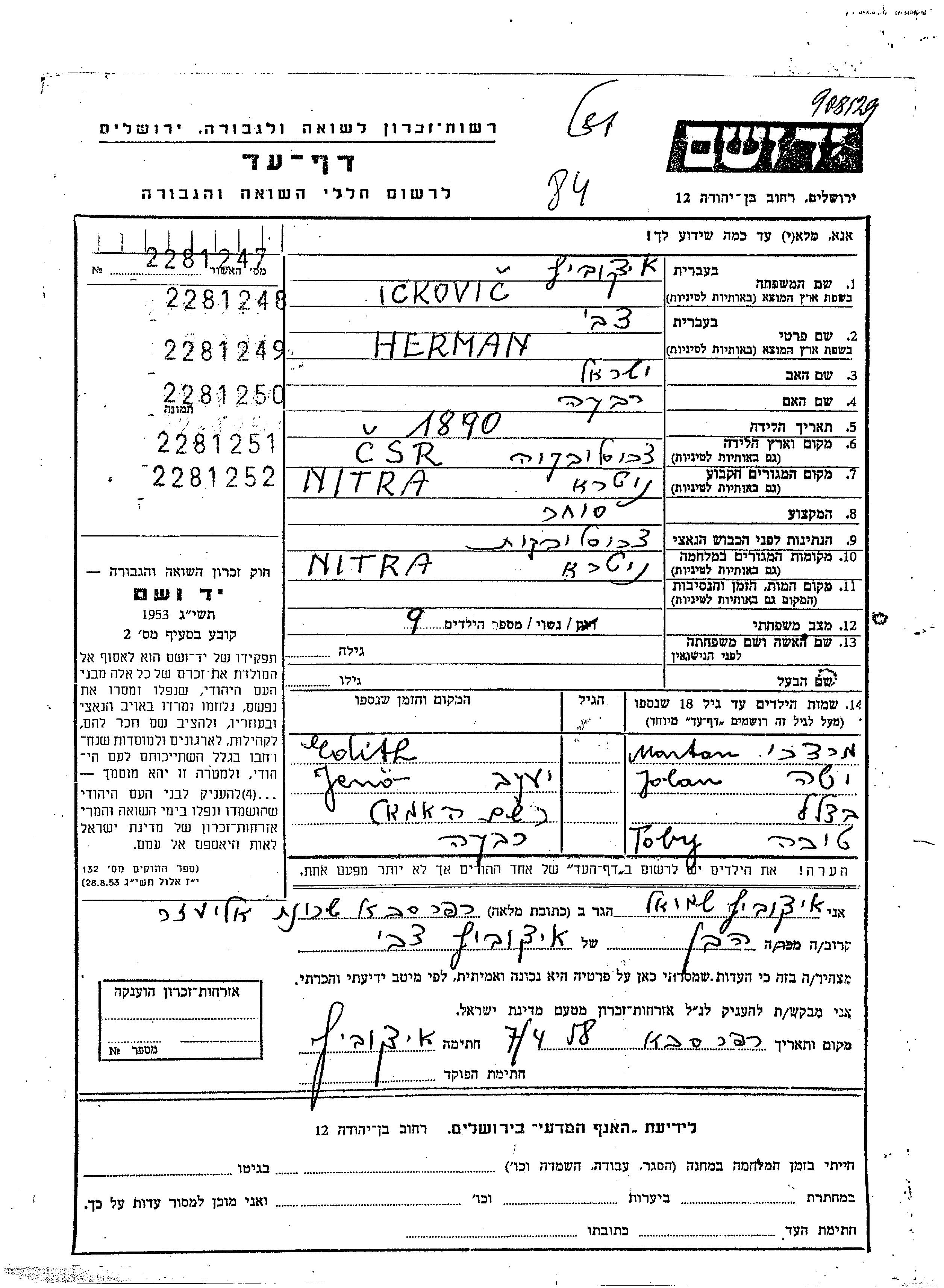 Ickovic Mordekhai Marton Nitra, Tchécoslovaquie Feuille de témoignage